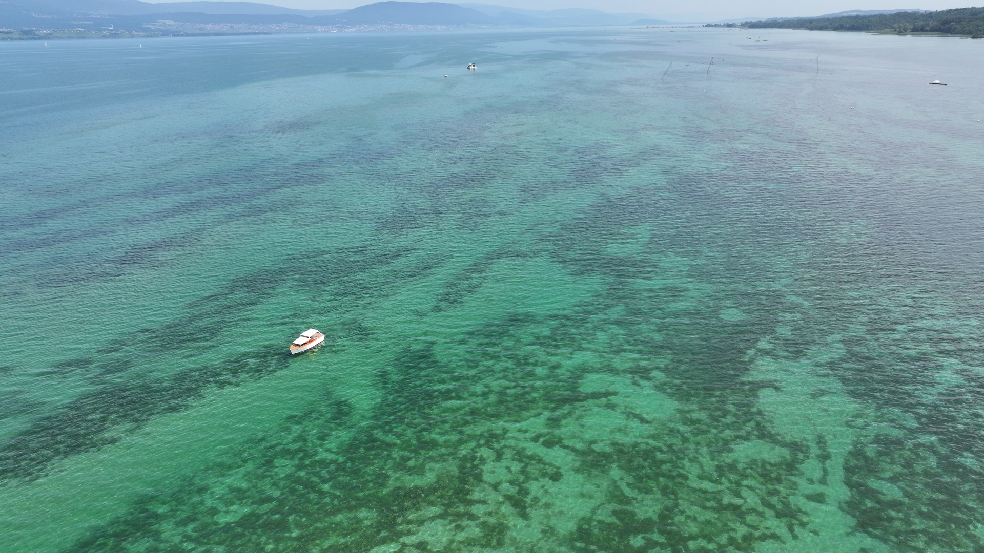 L’embouchure du canal de la Broye se situe au nord-est du lac de Morat. Celui-ci, d’une longueur de 8,4 km, permet de rejoindre en 30 min à 15km/h (8 nds) le lac de Neuchâtel. On coupe les gaz. À cette allure, nous déplaçons de l’eau mais le volume sonore diminue sensiblement.