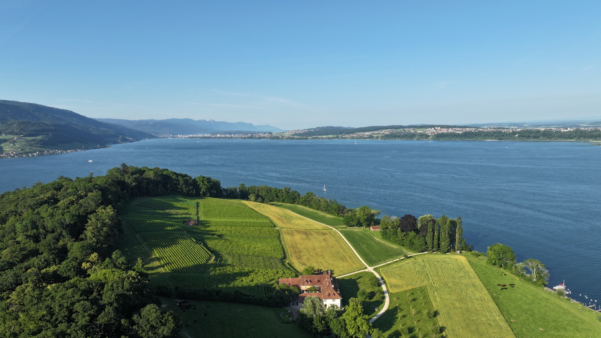 En face, la rive nord du lac de Morat est plus vallonnée avec de beaux plants de vignes à flanc de coteau, notamment ceux du Mont-Vully, qui donne un vin blanc faisant la fierté des habitants de la région.
