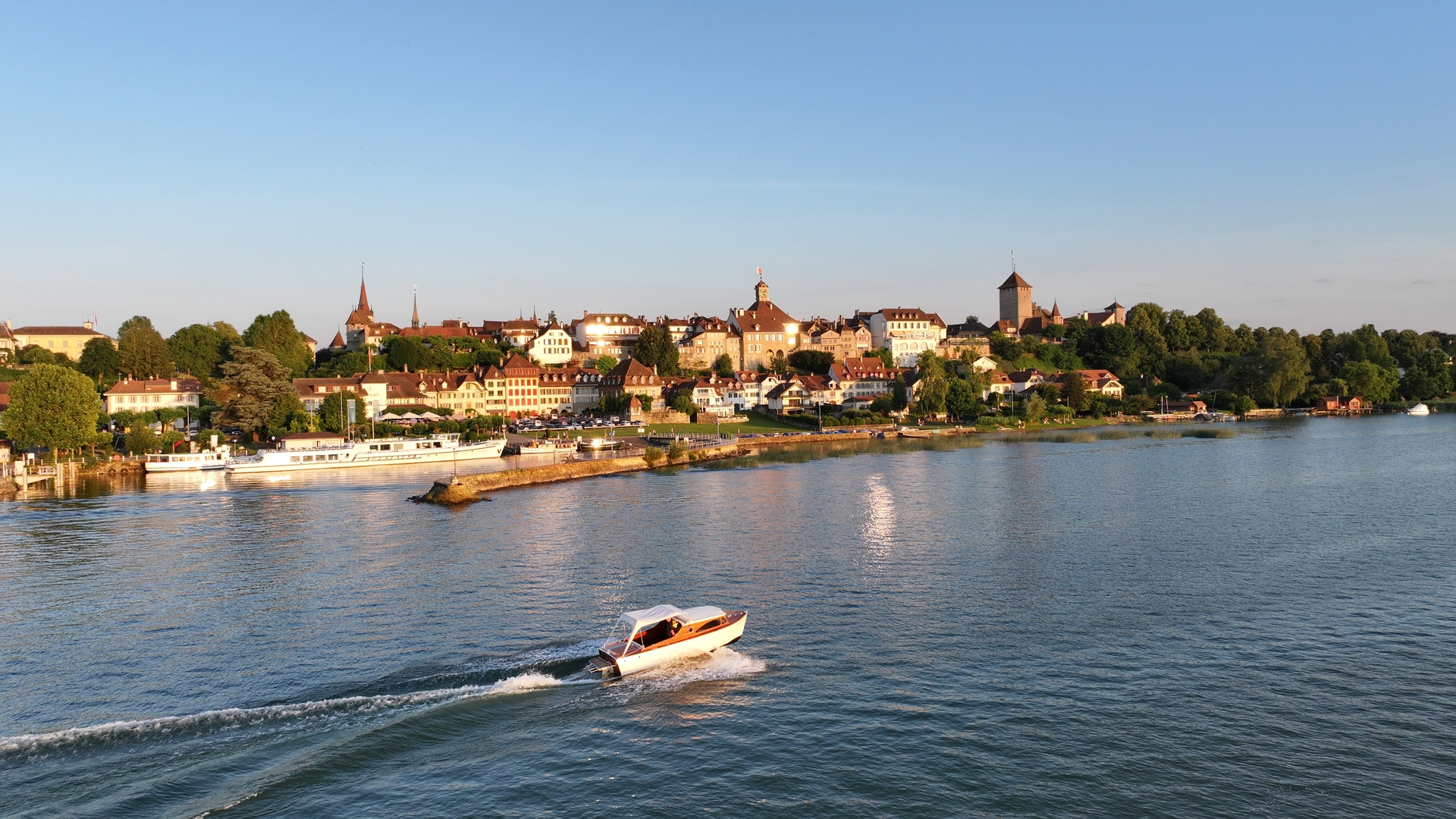 La charmante petite ville de Faoug est quasiment juchée sur la frontière délimitant le canton de Vaud à celui de Fribourg. Ce sera notre lieu de rendez-vous, en cette chaude matinée de juin, et plus précisément sur le quai de la marina Jack Beck où un magnifique canot à moteur des années 1970 m’attend. Celui-ci, tout habillé de bois vernis, revêt déjà son bimini pour nous protéger du soleil qui s’annonce puissant. Le but de cette croisière lacustre est de découvrir une grande partie des options de