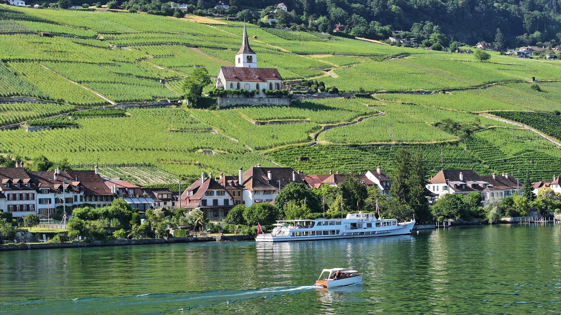 Nous quittons le ponton de l’hôtel St Petersinsel en prenant un cap Nord-Est, direction Bienne. D’un bout à l’autre, le lac fait 15 km (8 min), la rive nord est plus escarpée que celle du lac de Neuchâtel et beaucoup moins urbanisée. Forêt, vignoble et petits villages s’y mélangent harmonieusement.
