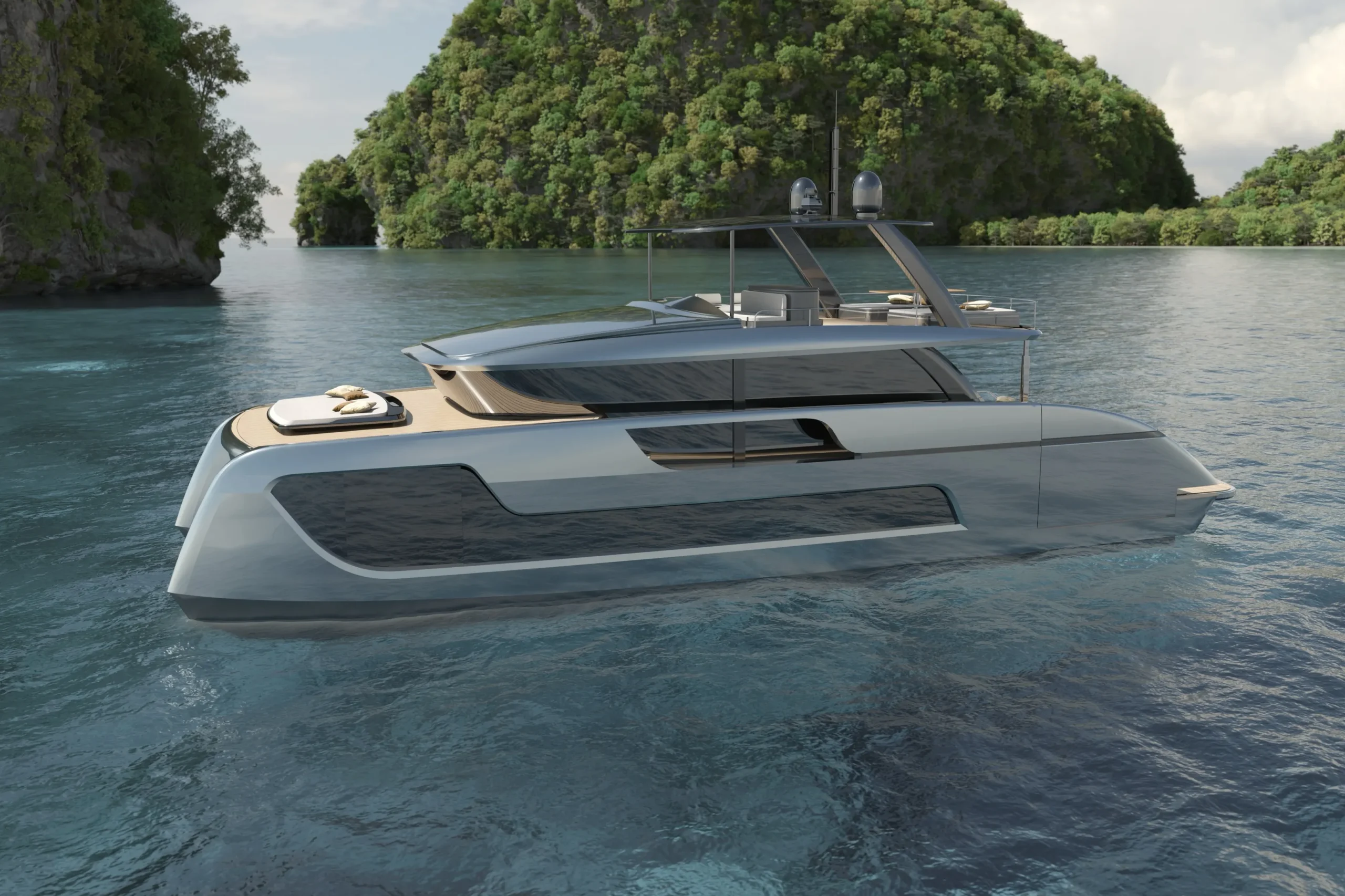 L’Ultima 66 fait partie des six modèles de la nouvelle gamme de catamarans à moteur (14 à 36 m) du chantier polonais. Cette série marque une rupture de style et de conception avec les Sunreef Power. Les Ultima arborent une silhouette plus dynamique, avec des étraves et une façade de timonerie inversées, ainsi qu’une poupe avec pavois ouvrants. Autre différence : les Ultima sont sensiblement moins larges. Objectif : la recherche d’un meilleur rendement pour la propulsion électrique. Pour autant, la surface cumulée dépasse les 200 m 2 utiles, avec un espace cabines aménagé sur toute la largeur du tunnel : trois cabines invités, deux pour l’équipage et, à l’avant, une cabine principale pleine largeur avec un accès indépendant. Toutes ces cabines bénéficient d’une salle d’eau privative. À l’intérieur, le pont principal se divise en trois salons et une cuisine