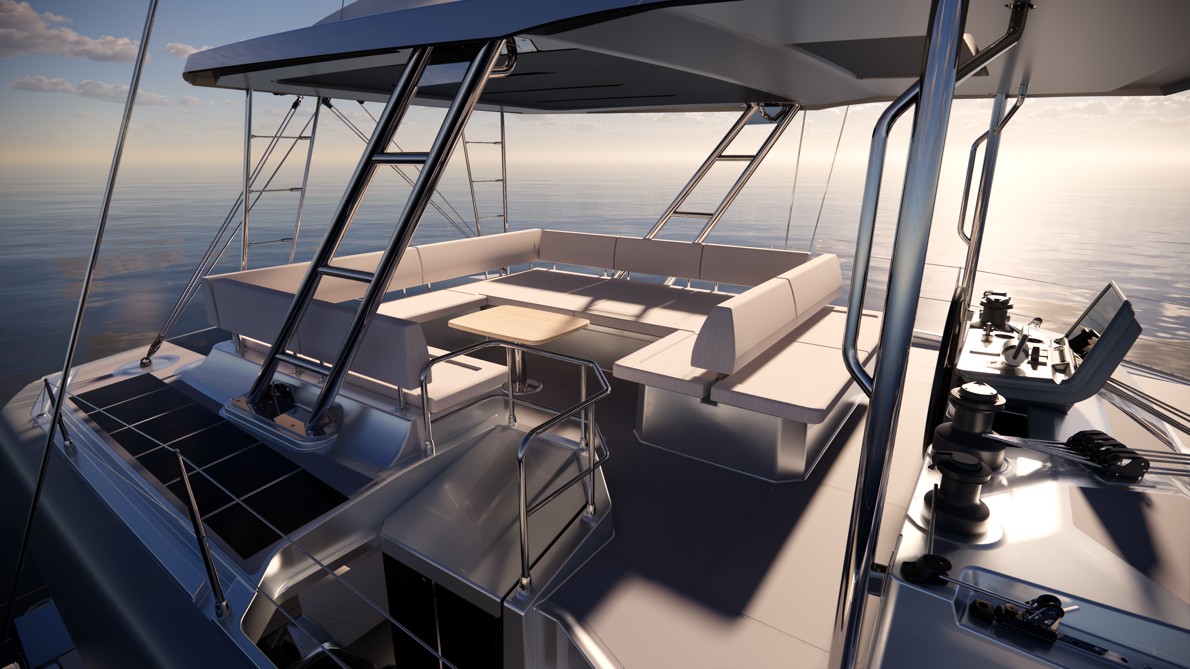 Côté aménagement, Aquila reprend les codes qui ont fait son succès en Powercat : volumes, modularité et circulation. Le chantier propose des configurations de 4 à 6 cabines, un point évidemment stratégique pour le charter premium, mais aussi pour les propriétaires qui naviguent en famille élargie ou avec équipage. Autre élément intéressant, le cockpit avant entièrement rigide est pensé pour la détente. Cette zone de vie à part entière fera les délices de l’équipage au mouillage ou en navigation par beau temps. Les astuces qui simplifient la vie sont nombreuses, comme la possibilité de passer du fly au cockpit avant directement tandis que la plateforme arrière modulable accueille une grande annexe ou se transforme en véritable « beach club », le tout sans recourir à l’hydraulique.