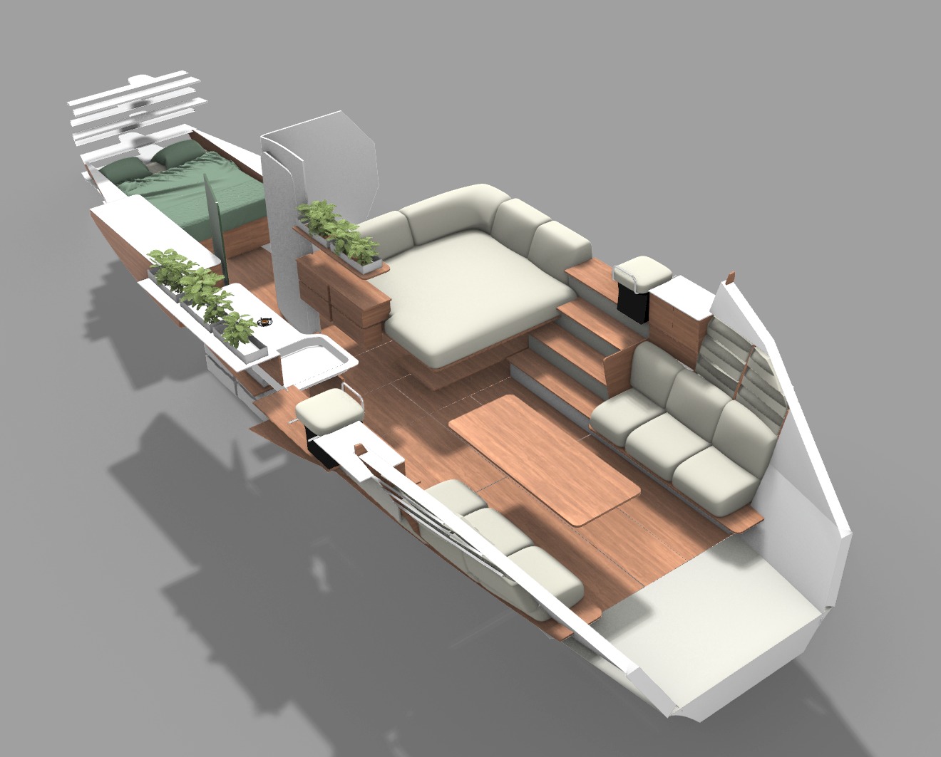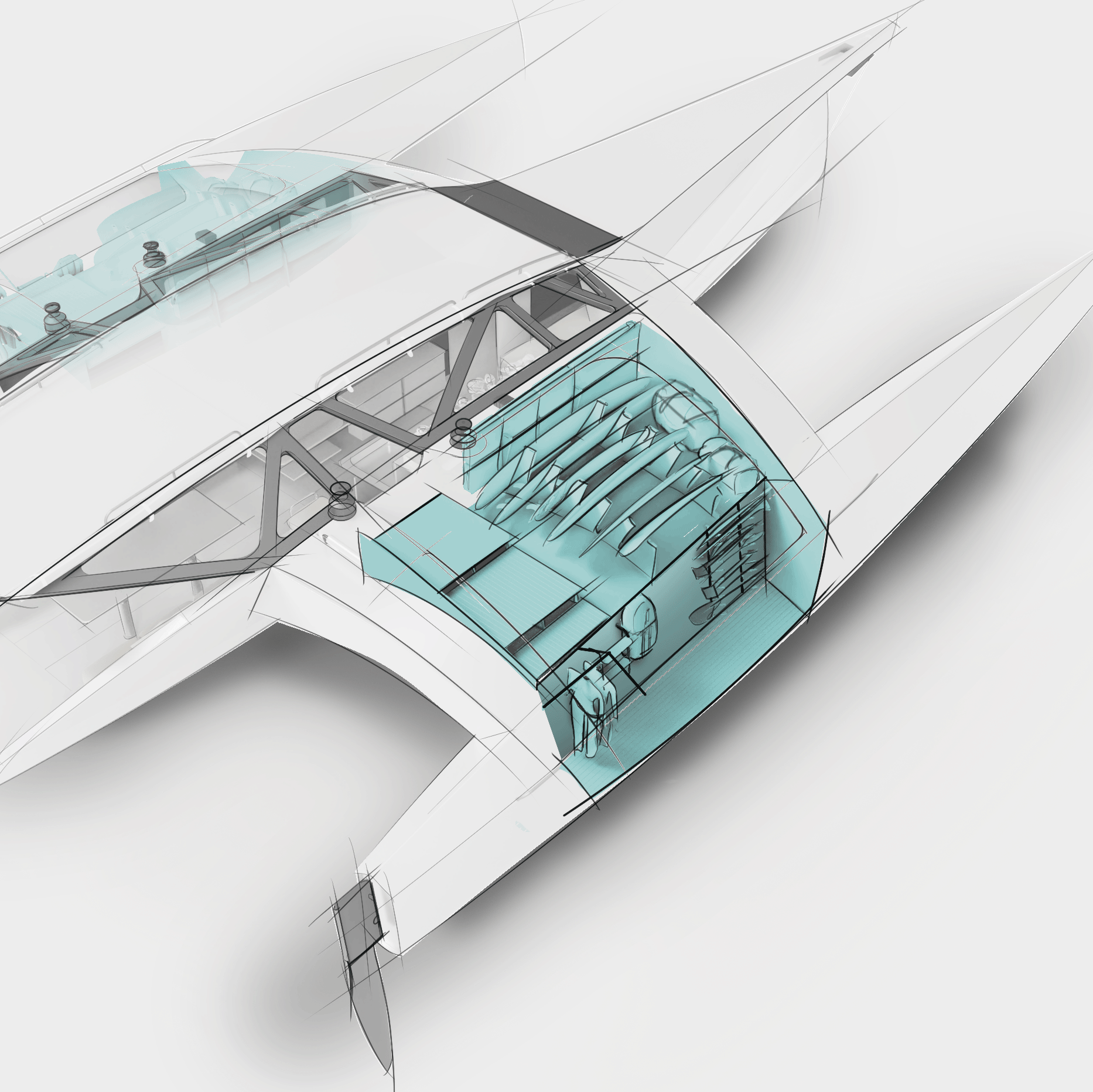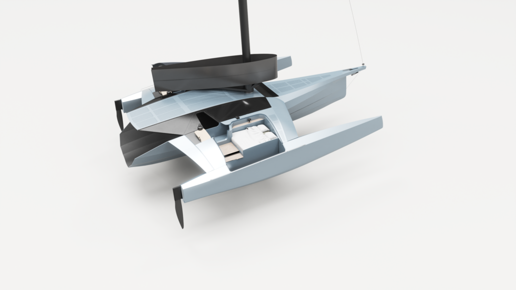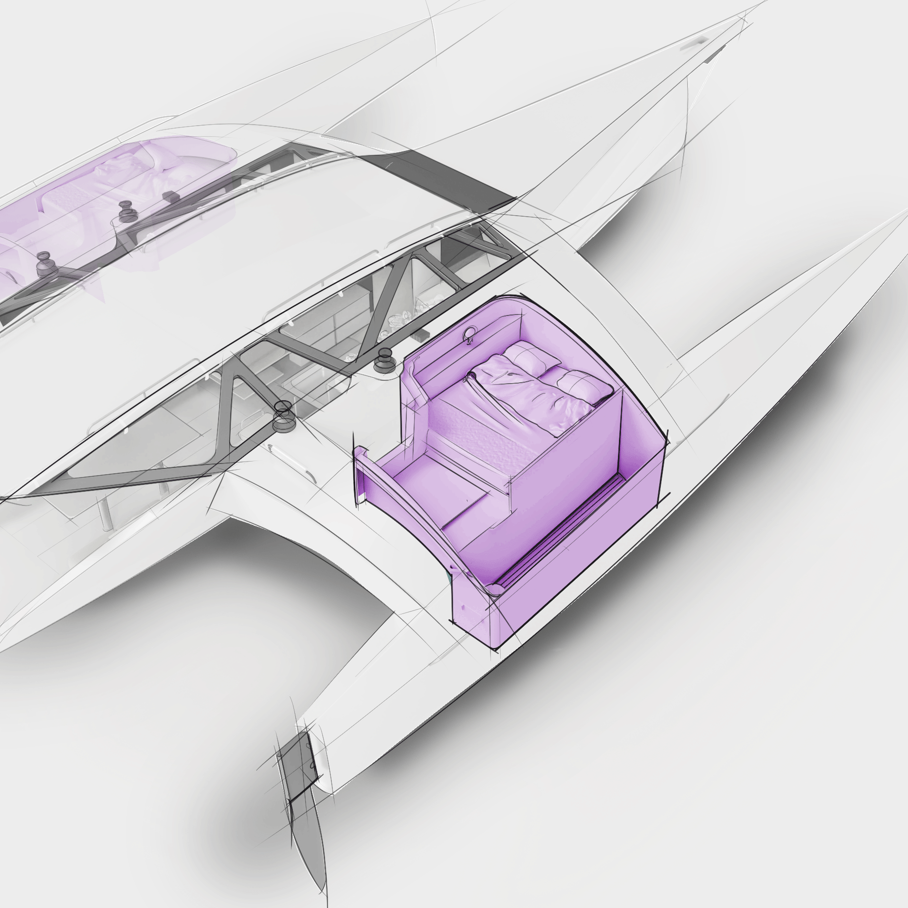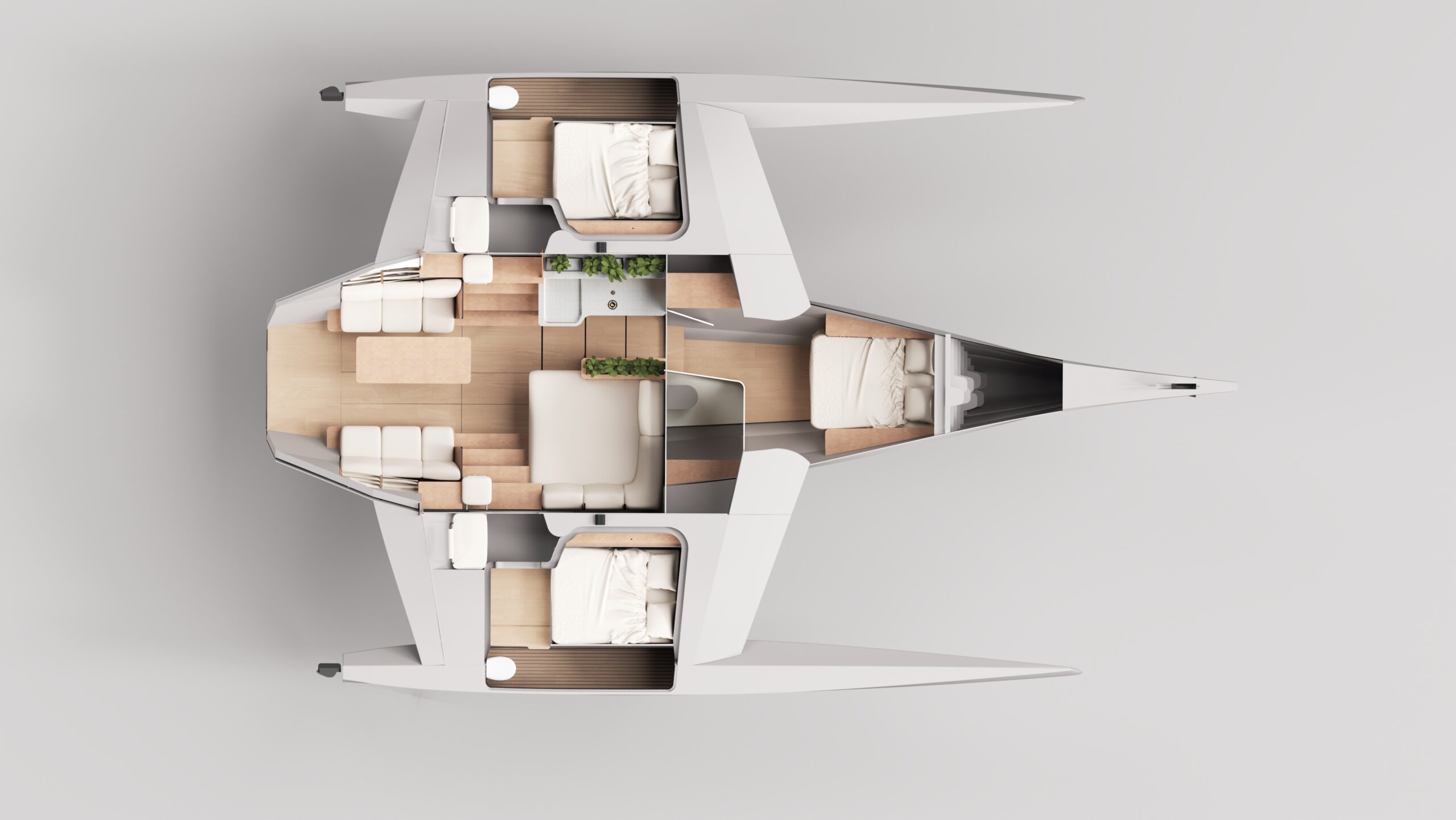 Ce trimaran de 14,20 m sur 9,15 m peut ainsi être aménagé selon les souhaits de son skipper, avec des modules de couchage installés dans les ailes, dans un esprit van life. Ces ailes peuvent aussi servir au stockage des planches de surf, de l’avitaillement pour la grande croisière et de bien d’autres équipements… Avec l’Ipsum 45, la seule véritable limite reste celle de l’imagination.