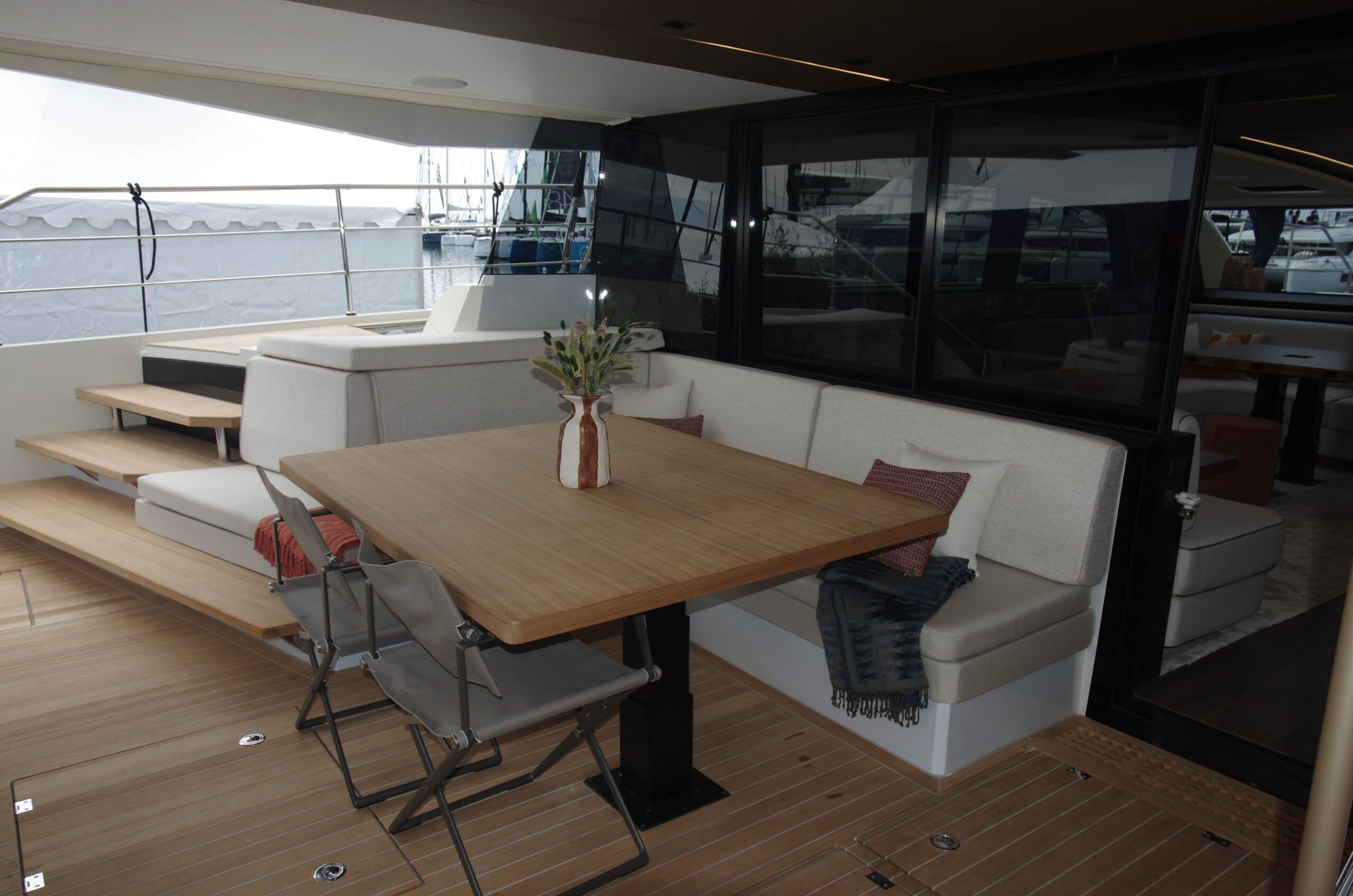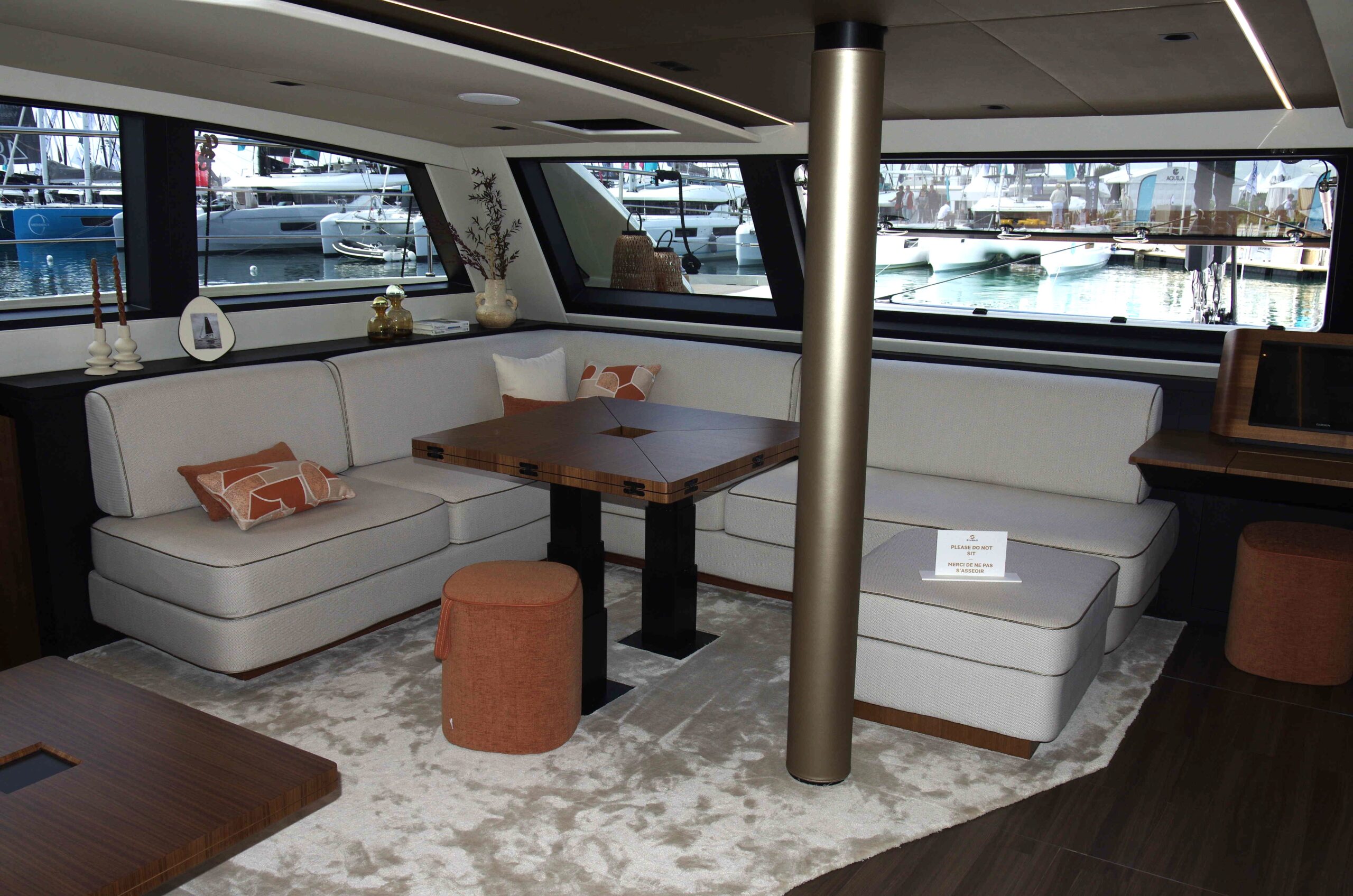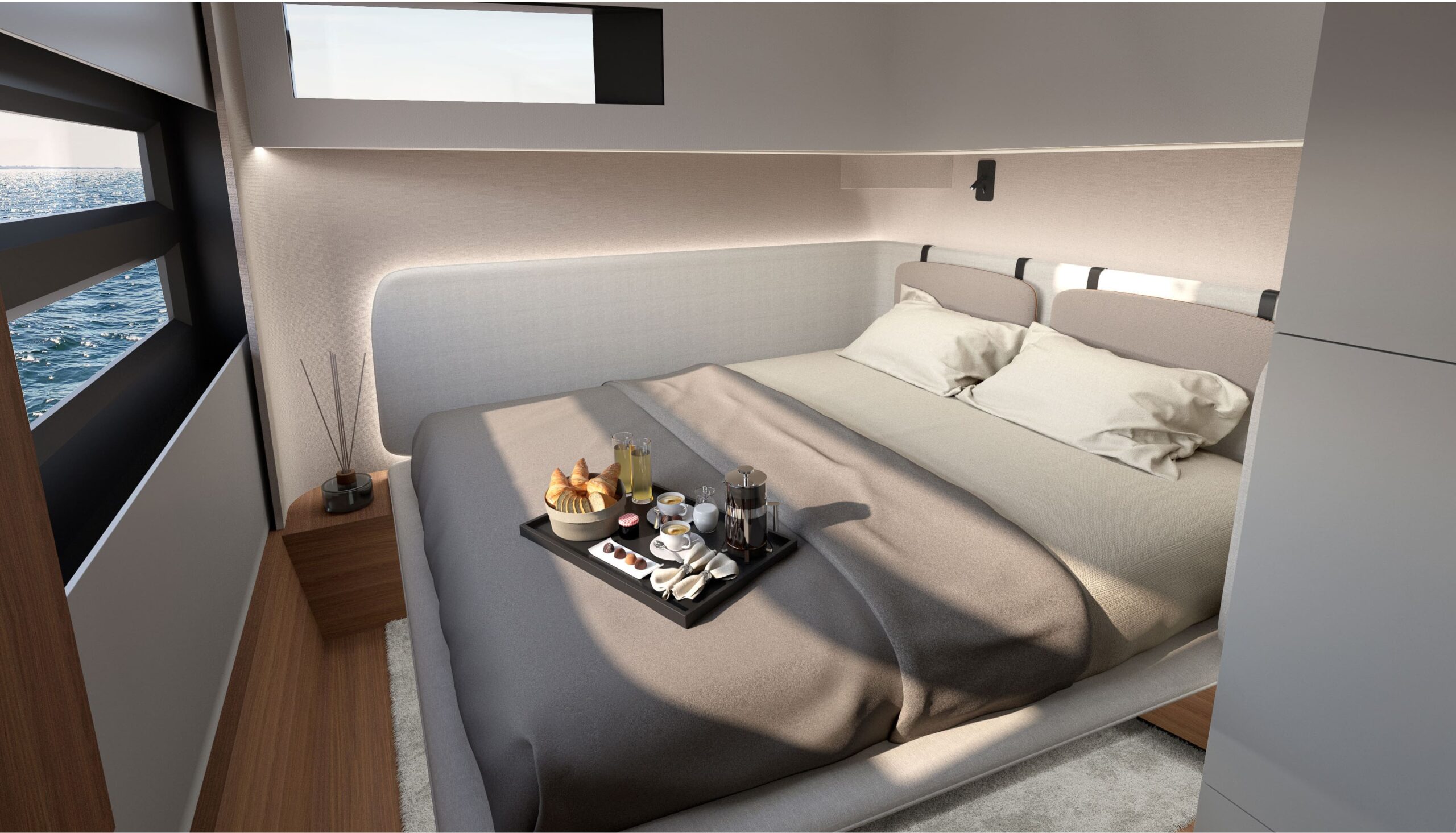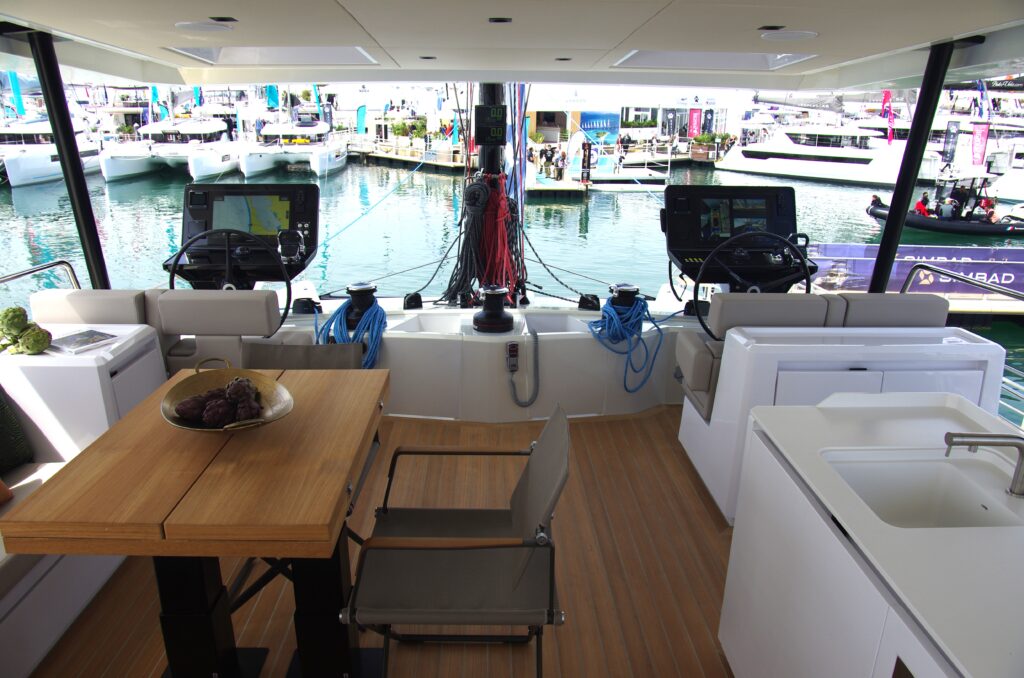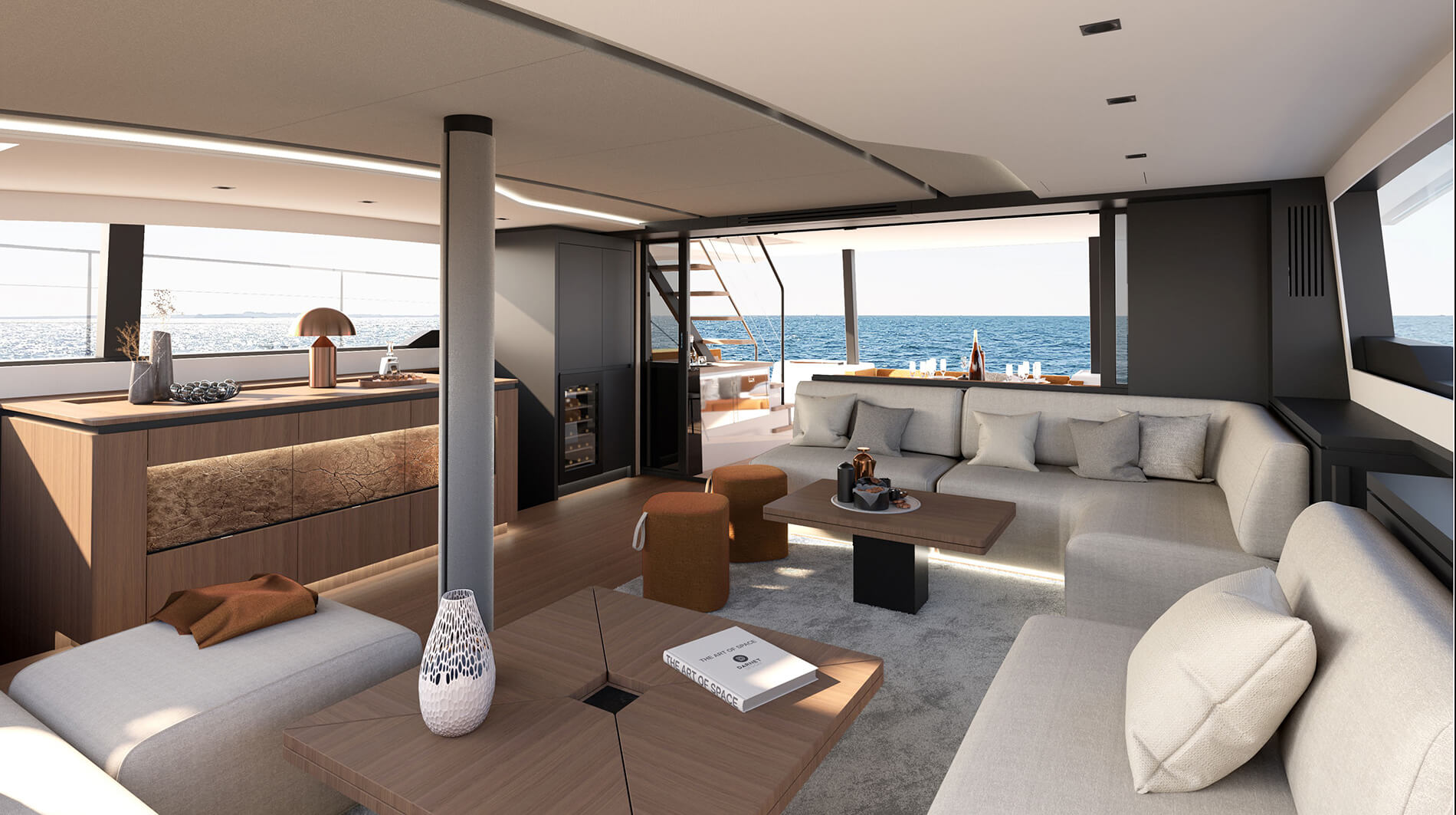 À bord, le Simbad 55 joue la carte du « mieux qu’à la maison » : flybridge généreux, cockpit avant protégé, grandes surfaces vitrées qui s’opacifient d’un simple clic pour l’intimité au port, boiseries en chêne blanchi ou noyer, domotique, équipements Miele, cave à vin, climatisation, dessalinisateur et technologie Sea.AI pour la veille et la détection d’obstacles. Le Simbad 55 est proposé en 3 différentes versions de finition (Legend, Ultra ou Select) et avec la cuisine en coursive ou en haut. Un catamaran qui pousse le curseur de la technologie, avec les moteurs, safrans et propulseur d’étrave commandé par un joystick et un système de caméras à 360° qui offrent une maîtrise totale du bateau en équipage réduit.