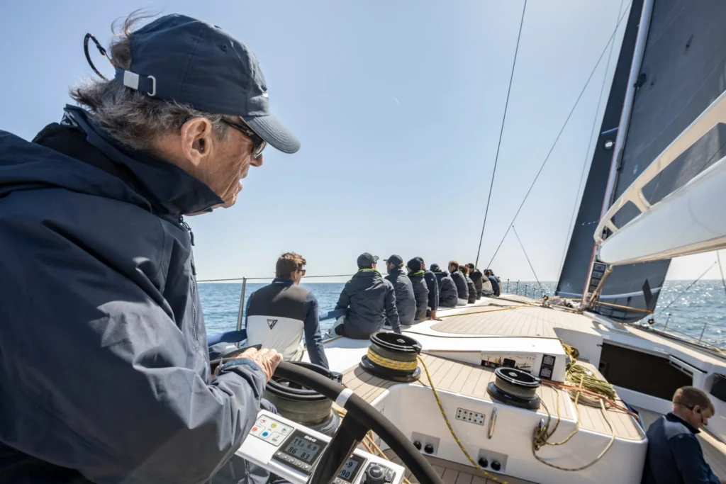 Ce dimanche d’avril, Magic Carpete prend le large. Le clocher rouge et jaune de Saint-Tropez s’efface lentement dans notre sillage. Résident tropézien à l’année, le Maxi est devenu une figure locale, au même titre que la statue de Brigitte Bardot ou la célèbre gendarmerie. Sir Lindsay, lui, vit désormais à Lugano mais reste fidèle à ce port d’attache… et à ses équipiers.