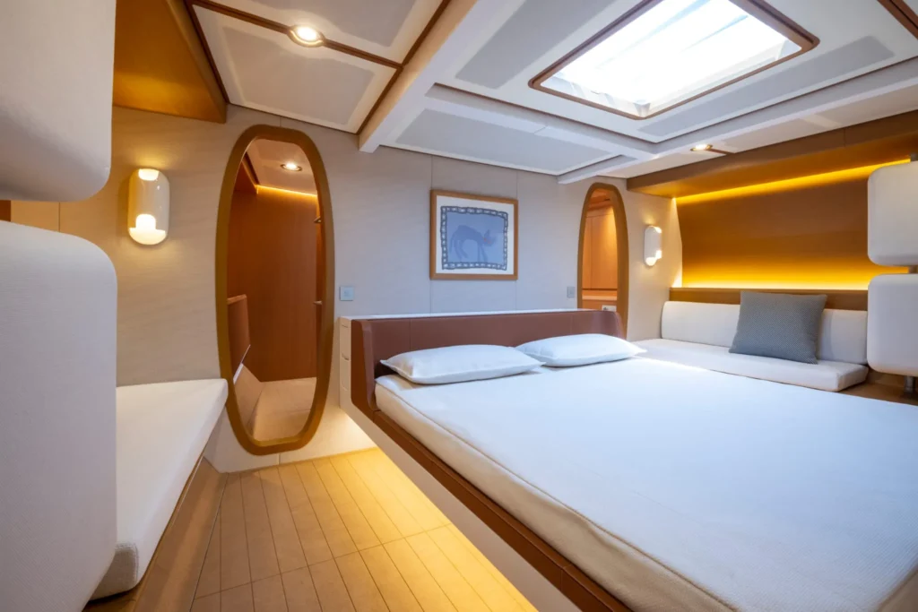 Troisième exigence du propriétaire : l’autonomie énergétique. Une journée de régate pour seulement cinq heures de charge à quai. Sur Magic Carpet e, toutes les manœuvres sont électriques, à commencer par la quille, chef-d’œuvre imaginé par l’architecte Guillaume Verdier et réalisé par le chantier Persico. Pendulaire à 45°, elle peut aussi se rétracter vers l’arrière : en quelques secondes, le bulbe de 9 tonnes passe de 7,1 à 4,6 m de tirant d’eau. Un canard de 5,5 m assure l’antidérive.