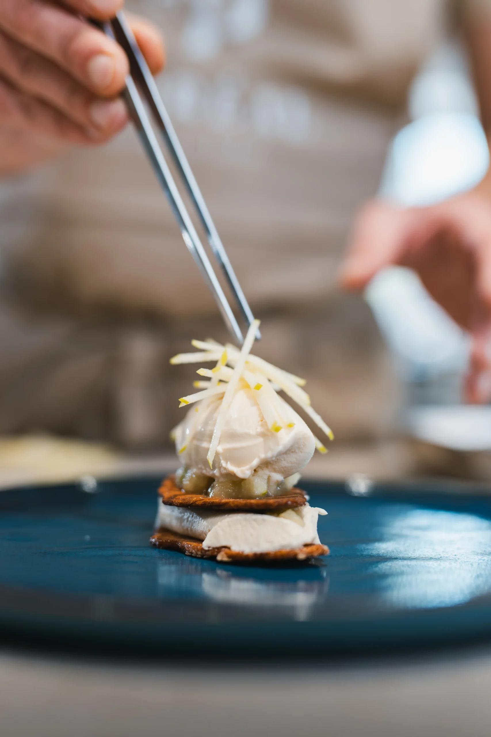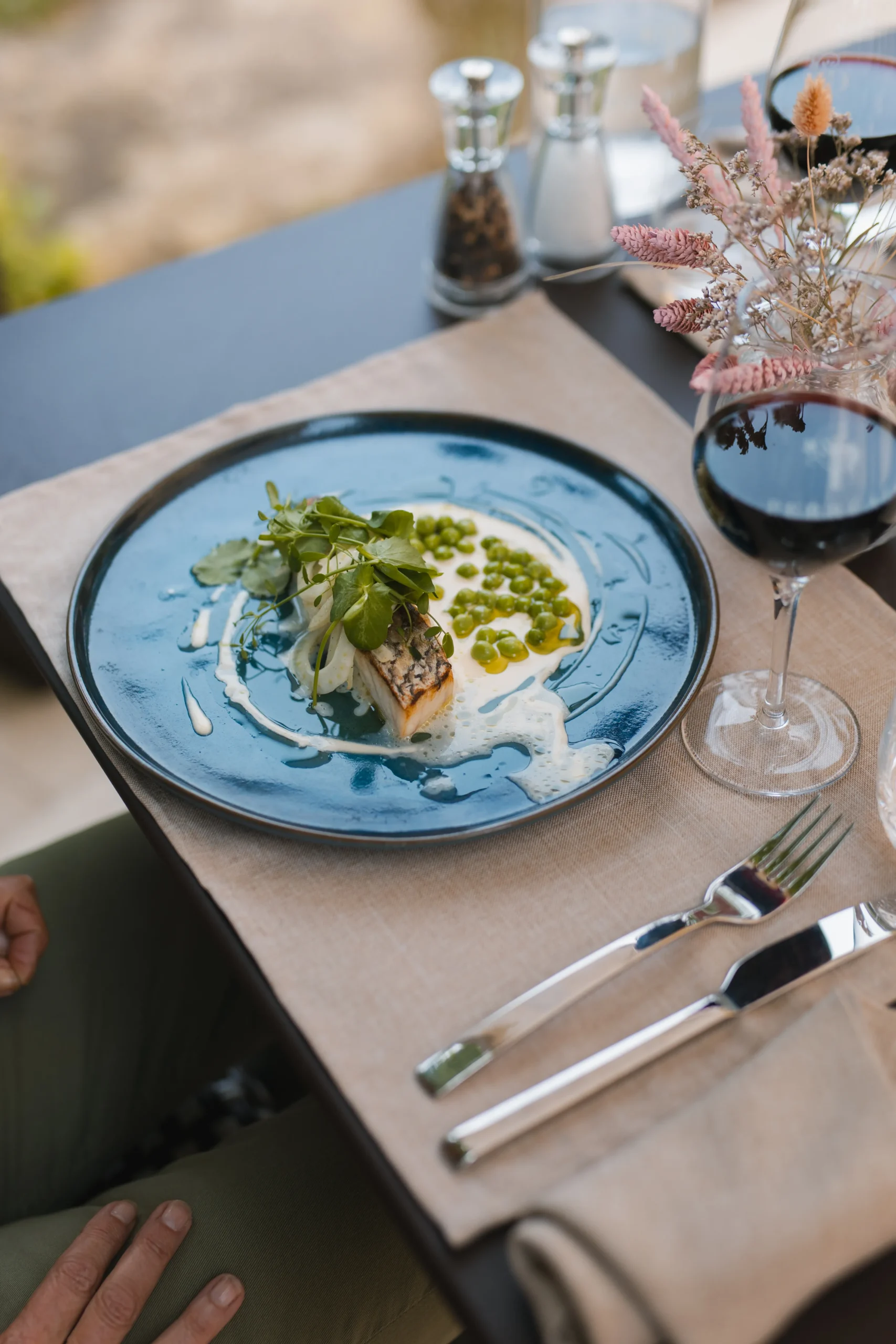 Le Domaine, qui s’étend sur 54 hectares au cœur du Parc naturel régional du Luberon, classé réserve de biosphère par l’Unesco, connaît un nouvel essor depuis qu’il a été repris par quatre associés tombés sous son charme en 2020. Suite à un vaste programme de rénovation et d’extension, la bastide du XIXe siècle abrite quatre gîtes et quatre chambres d’hôtes, des espaces à la fois chaleureux, confortables, élégants et exclusifs… du raffinement sans ostentation. Les gîtes classés 3 étoiles comprennent, outre les pièces communes, deux chambres et une terrasse privée chacun. Sur les quatre chambres, trois sont des suites composées de deux chambres. À l’extérieur, on pourra profiter d’un jardin arboré, se baigner dans l’une des deux piscines et admirer un paysage à couper le souffle qui embrasse les ocres de Roussillon, Gordes et les contreforts du Ventoux. Avec une capacité de 39 personnes au maximum, le Domaine Perréal est un havre de paix à 350 m d’altitude, au pied de la colline du même nom. La petite chapelle de Sainte-Radegonde, érigée en 1551 à son sommet, est un ancien lieu de pèlerinage. En outre, les nouveaux propriétaires (dont un entrepreneur-navigateur suisse) ont aménagé des espaces de réception, intérieurs et extérieurs, un caveau de vente et de dégustation des produits du domaine ainsi qu’un restaurant bistronomique, La Table du Domaine Perréal, qui peut assurer jusqu’à 40 couverts par service. Un couple de chefs, Lucia Ampudia et Maxime Martinage, tous deux formés dans des établissements étoilés, propose une cuisine à base de produits de saison locaux, dont les légumes cultivés dans le potager du domaine. On vous proposera naturellement de déguster les plats créatifs et colorés avec un vin produit sur place.