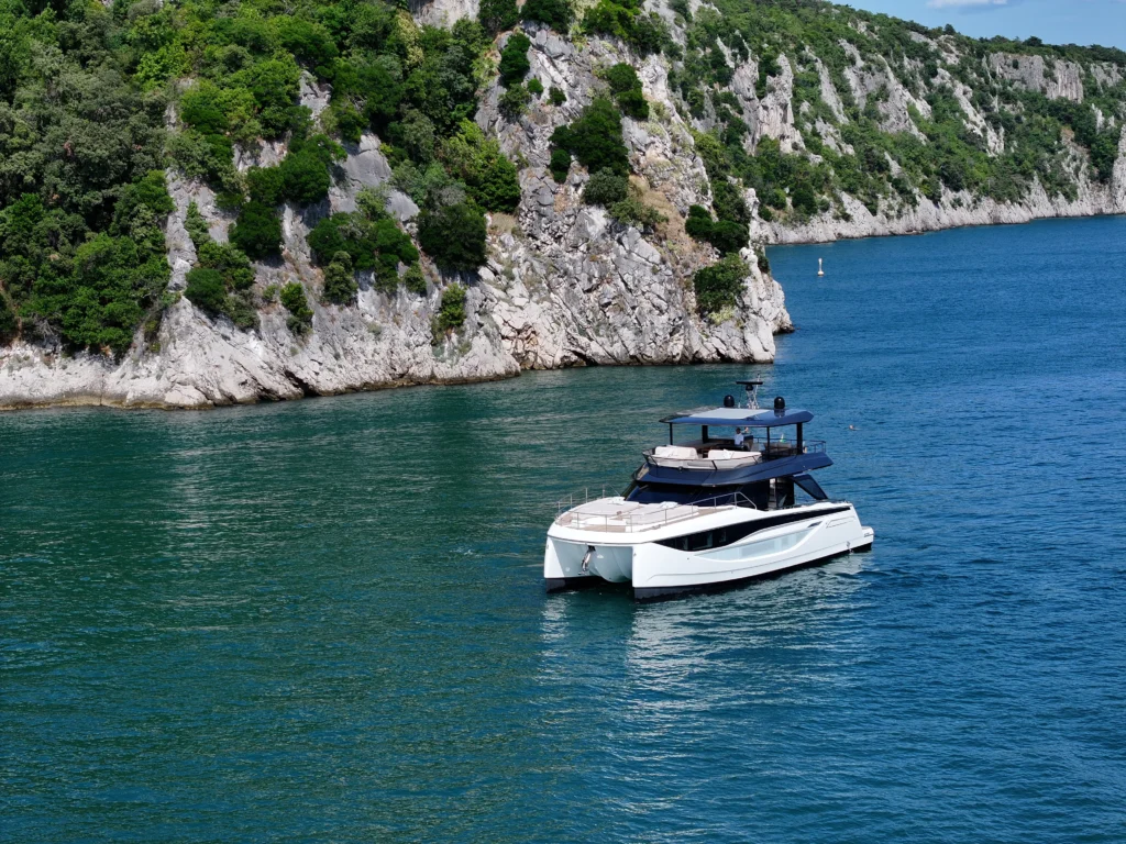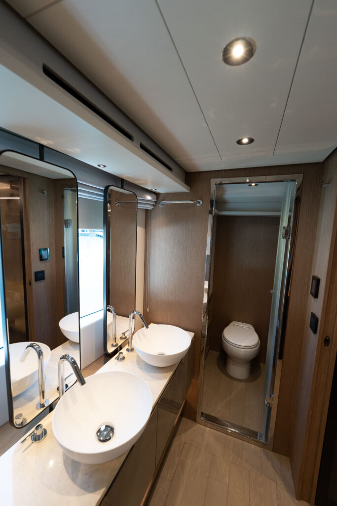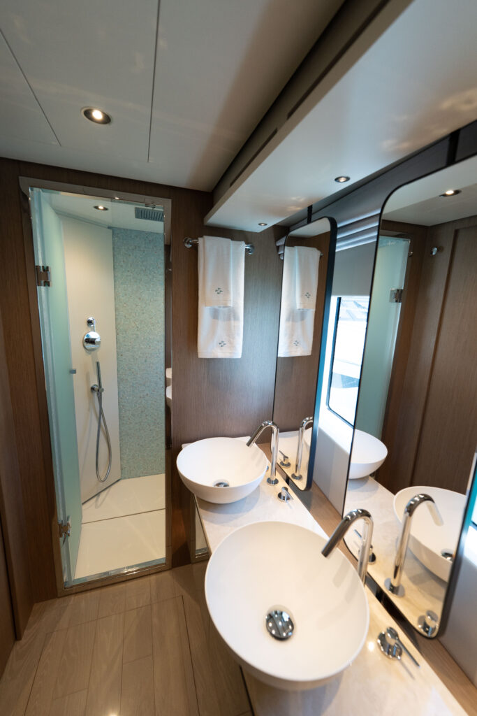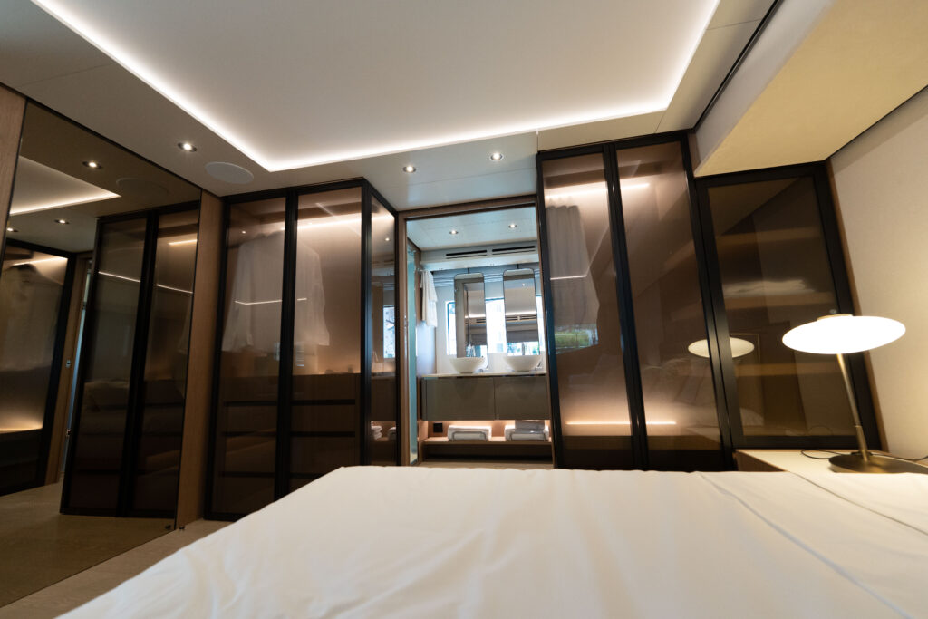 Ein Novum ist der backbordseitige Durchstieg, der direkt zum Seitendeck und zur Flybridge-Treppe führt. Diese ist anders als üblich verkehrt angeordnet, sodass die Flybridge ohne Platzverlust sowohl von innen als auch von aussen wettergeschützt erreicht werden kann. Das grosszügig verglaste Deckshaus betritt man über einen breiten Eingang. An Steuerbord kann anstelle eines modern-minimalistischen Salons ein grosser Esstisch montiert werden. Im Vorschiff ist an Backbord eine grosse u-förmige Küche integriert. Gegenüber lässt sich optional eine Bar oder ein zweiter Steuerstand einbauen. Das Brückendeck ist hoch genug, damit die Kabinen auf dem Unterdeck einen Grossteil des Raums zwischen den beiden Rümpfen nutzen können. Alles in allem umfassen die Schlafbereiche eindrückliche 53 Quadratmeter. Besonders grosszügig ist die lichtdurchflutete Eignersuite im Bug. Mit ihren 20 Quadratmetern, dem grossen Badezimmer, den vielen Stauflächen und einem Schreibtisch lässt es sich darin äusserst komfortabel leben. An Backbord, vor den Schlafplätzen der Crew, liegt mittschiffs die 10 Quadratmeter grosse VIP-Kabine. Links und rechts des Niedergangs befinden sich zwei weitere Kabinen mit einer Fläche von 6 und 8 Quadratmetern. Angetrieben wird der Luxus-Powerkat von zwei Motoren. Bei einem davon kann die Drehrichtung des Propellers umgekehrt werden, was beim Manövrieren auf engem Raum ein Riesenvorteil ist. Die gegenläufigen Propeller ermöglichen selbst ohne elektronische Hilfen (die selbstverständlich vorhanden sind!) präzise Drehbewegungen. So wird Einparkieren zum Kinderspiel. Der M7 spricht so direkt und feinfühlig an, dass man das Gefühl hat, ein deutlich leichteres Boot zu steuern. Wie schon der M48 und der M8 wurde auch dieses Modell aus Effizienzgründen schlicht gehalten und verbraucht dadurch weniger Treibstoff.