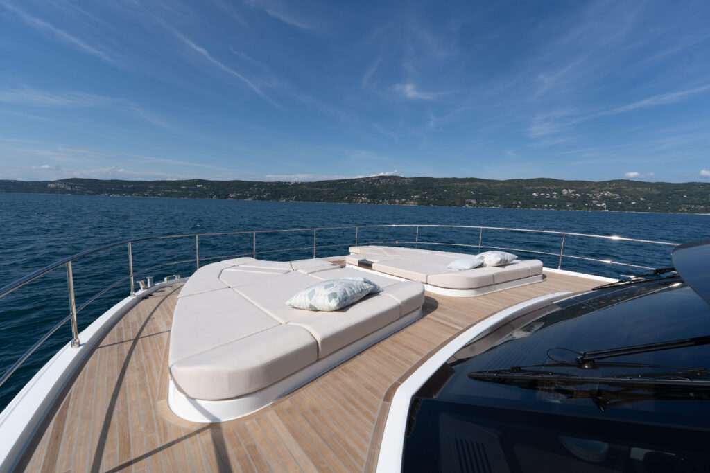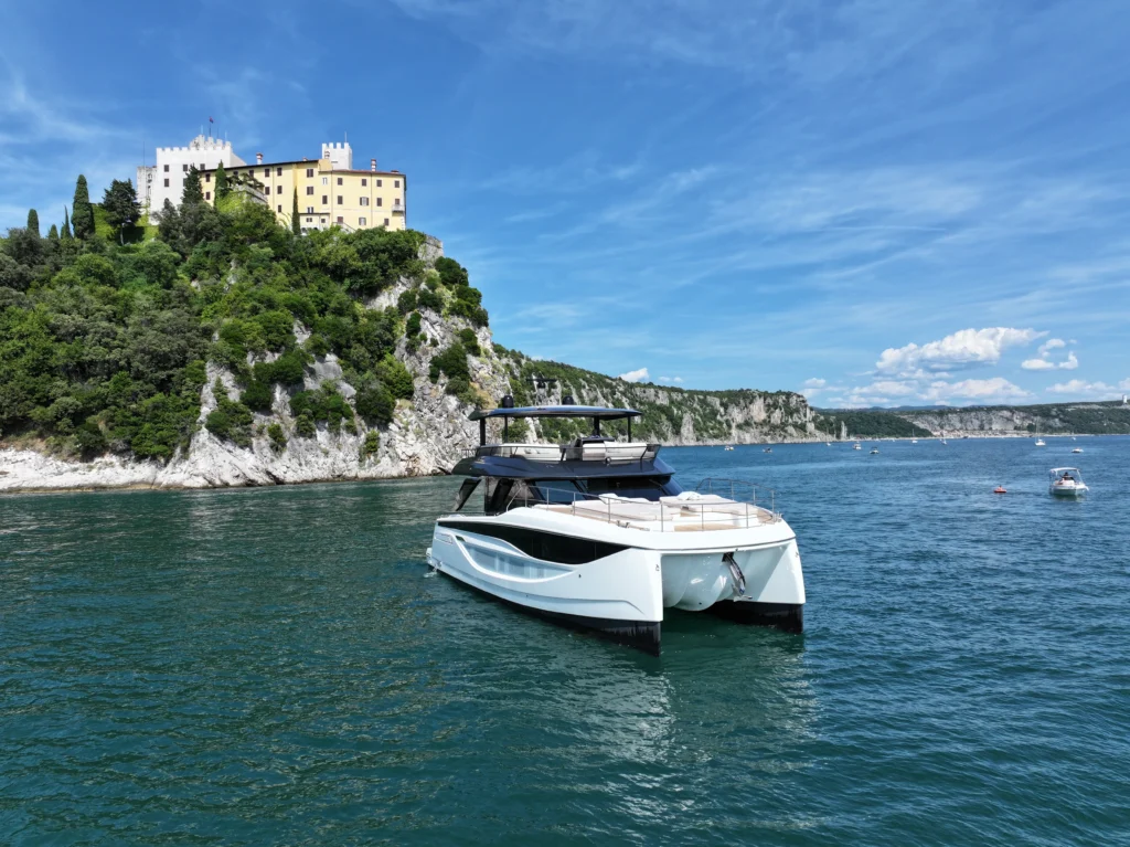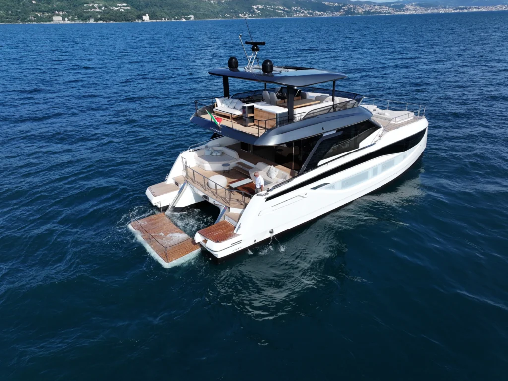 Doch gehen wir nochmals ein paar Jahre zurück. 2022 lancierte Prestige mit dem M48 seinen ersten Motorkatamaran. Da die Marke 33 Jahre ausschliesslich Einrumpfjachten produziert hatte, kann davon ausgegangen werden, dass die Marketingstrategie hinter dem Kurswechsel gut durchdacht war. Die Ansprüche der Kunden wuchsen fortlaufend. Sie wünschten zunehmend mehr Komfort und mehr Lebensraum, doch die X-Line stiess diesbezüglich an ihre Grenzen. Also entschloss man sich gemeinsam mit der Beneteau-Gruppe, den Markt der Powerkats zu erschliessen. Die treue Kundschaft wollte man aber auf keinen Fall verlieren. Prestige brach daher nicht mit der bisherigen Philosophie, sondern entwickelte ein Modell auf zwei Rümpfen, das den Markenwerten treu bleibt und zugleich umweltfreundlich ist. Bei gleicher Geschwindigkeit und Verdrängung verbraucht ein Katamaran rund 40 Prozent weniger Treibstoff als eine Einrumpfjacht. Prestige ging sogar noch einen Schritt weiter und begrenzte die Höchstgeschwindigkeit seines Modells aus ökologischen Gründen auf 20 Knoten, was deutlich unter dem marktüblichen Standard von 25 Knoten liegt. Mit dem Gesamtdesign des M48 wurde Andrea Garroni beauftragt. Von seinem Reissbrett stammen seit dem Erstling alle Prestige-Modelle. Er sollte für die neue M-Line Mehrrümpfer entwerfen, die zwar im Einklang mit der Marken-DNA stehen, aber dennoch eine eigene Identität haben. Statt die Linienführung von den Segelkatamaranen abzukupfern, wurden ausschliesslich für den Motorantrieb ausgelegte Rümpfe gezeichnet, die den Powerkat schmaler, aber höher machen. Das Ergebnis überzeugte, der M48 war auf den ersten Blick als Prestige zu erkennen und doch ein Unikum. Philippe Briand hatte mit seinem Rumpfdesign den Nerv der Zeit getroffen. Dem M48 gelang am Cannes Yachting Festival 2022 ein Senkrechtstart. Mehr als die Hälfte der rund 20 an der Messe verkauften Boote waren M48! Die Geschäftsleitung von Prestige Yachts rechnet damit, dass sie allein mit der M-Line 40 Prozent des Gesamtumsatzes erwirtschaften wird. Vor zwei Jahren stellte Prestige mit dem M8 sein zweites Modell vor. M steht für Multihull, 8 für die Äquivalenz zu einem 80-Fuss-Monohull. Diese Bezeichnung hat sich in der Beneteau-Gruppe bereits etabliert und kommt vor allem in der MY-Reihe von Fountaine Pajot zur Anwendung. Prestige bietet in dieser Grössenklasse ultimativen Luxus, mit der Absicht, sich als grosser Player im Highend-Segment zu positionieren. Der endgültige Durchbruch soll mit dem neuen Flaggschiff gelingen. Dessen Rümpfe stammen im Übrigen von Marc Lombard Yacht Design.