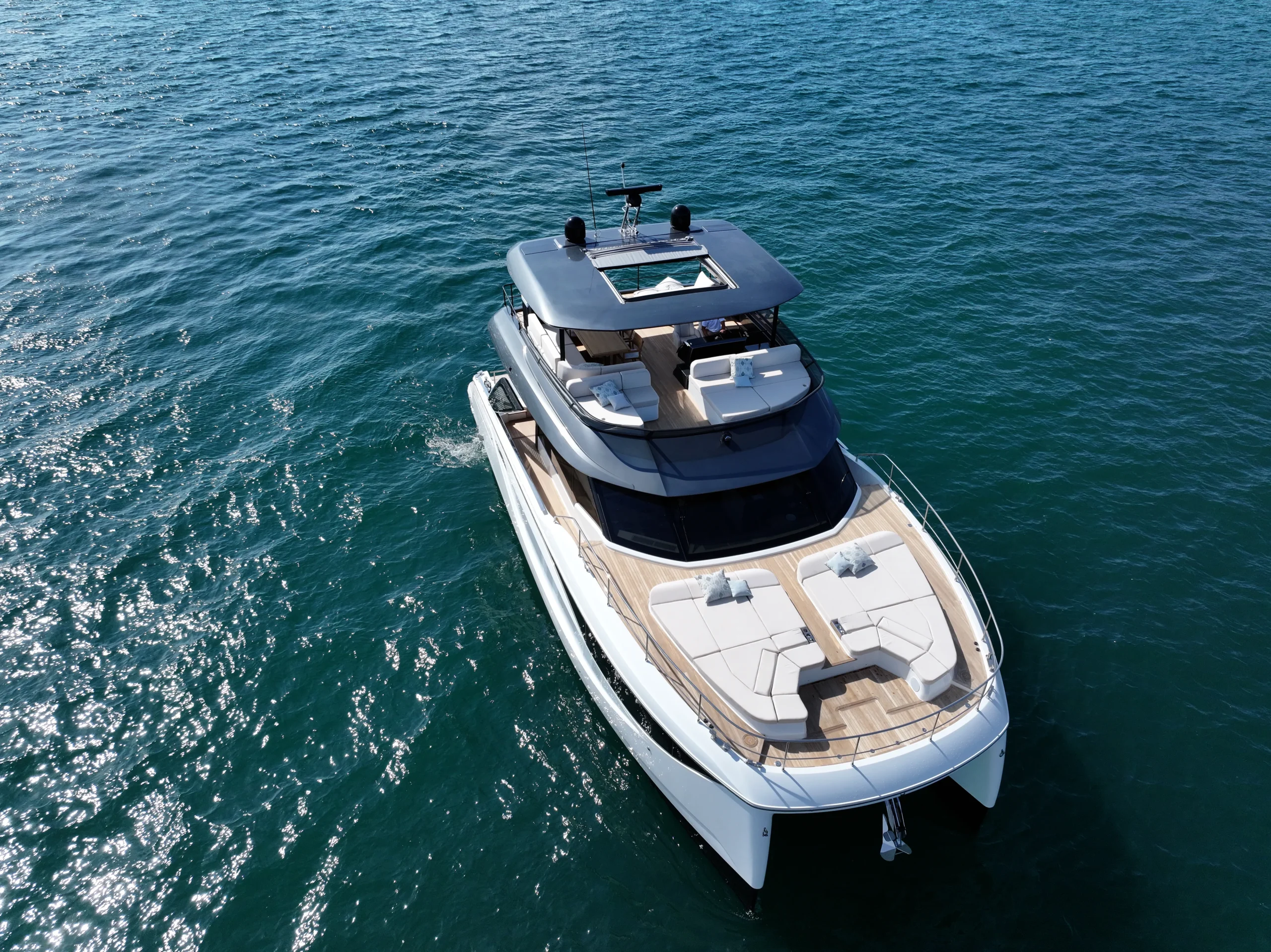 Die Mehrrumpfbauweise zeigt hier ihr volles Potenzial: Mit rund 200 Quadratmetern Wohnfläche, 112 allein auf dem Hauptdeck, bietet der Katamaran gleich viel Platz wie eine 75-Fuss-Einrumpfjacht. Der M7 gliedert sich in drei Bereiche: das Vordeck mit Sonnenliegen und Sitzgruppe, die Gangbords mit durchgehender Reling entlang des Deckshauses und das grossflächige, extrabreite und abgesenkte Cockpit. Wie die weiter unten beschriebene Flybridge kann auch das Cockpit unterschiedlich eingerichtet werden, entweder mit mittig platziertem oder nach Steuerbord versetztem Tisch und grosszügigem Salon. Das ohnehin schon aussergewöhnliche Cockpit wird durch eine riesige Terrasse vergrössert, auf der man das Meer mit Familie oder Freunden in vollen Zügen geniessen kann. Die zentrale Plattform lässt sich hydraulisch absenken, sodass sie mit den beiden Heckschürzen eine Ebene bildet und die ganze Bootsbreite als Beachclub genutzt werden kann. Sie bietet genügend Stauraum für ein stattliches Beiboot und lässt sich für einfaches Ein- und Aussteigen sogar unter die Wasserlinie tauchen. Zur Flybridge gelangt man über eine «verkehrte» Treppe. Der Steuerstand wurde weit nach achtern platziert, um direkt hinter der Windschutzscheibe genügend Platz für ausladende Liegeflächen zu schaffen. Dort ist man windgeschützt und bekommt dank des leicht nach hinten versetzten T-Tops mit Schiebedach dennoch genug Sonne. Optional ist der M7 auch mit einer Skylounge und geschlossener Flybridge erhältlich. Die 35 Quadratmeter lassen sich individuell konfigurieren.