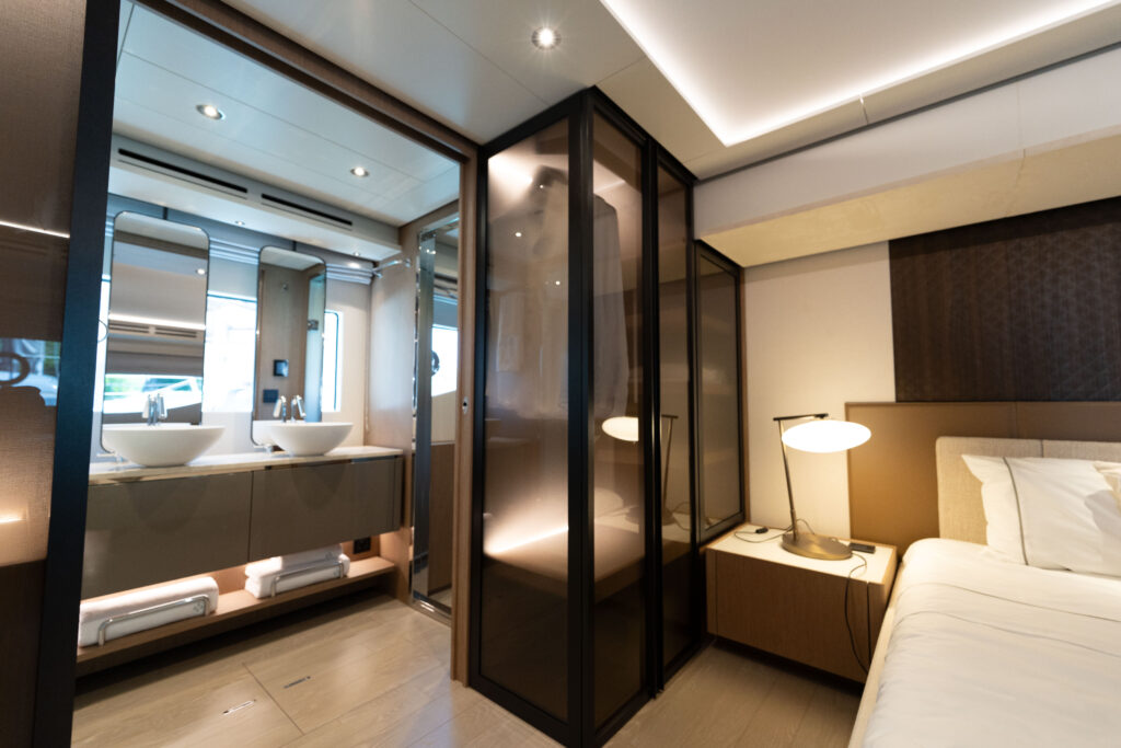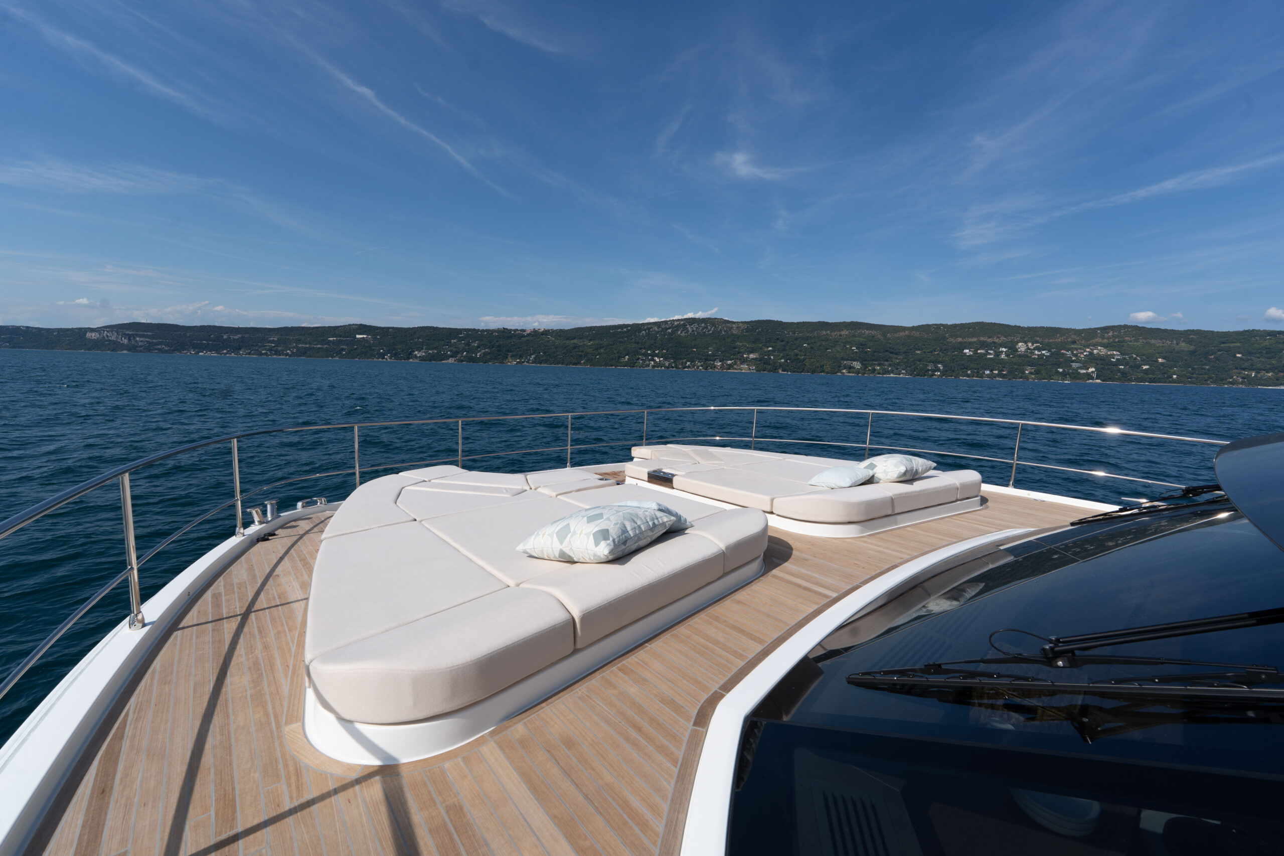Das dritte Modell der M-Line reiht sich zwischen dem M48 und dem M8 ein. Es wurde im Januar 2025 an der boot Düsseldorf angekündigt. Sechs Monate später präsentierte uns Prestige den M7 in einer exklusiven Premiere im italienischen Monfalcone, nur wenige Kabellängen von der Produktionsstätte entfernt. Schon vom Pier aus macht der imposante M7 mächtig Eindruck. Garonni Design hat sich nicht mit einem Copy-Paste begnügt, sondern gegenüber den beiden ersten Modellen viele spannende Neuheiten eingebaut, darunter ein dickeres Schanzkleid im Bugbereich, einen auf Cockpithöhe stärker ausgeprägten negativen Deckssprung sowie halbtransparente, klar von den Aufbauten getrennte Dachstützen und sattere Farben. Beim Betreten des Bootes fallen sofort das beeindruckende Raumgefühl und die hochwertige Verarbeitung auf. Prestige verwendet ausschliesslich hochwertiges Material und edle Stoffe, die geschmacksvoll kombiniert ein Gefühl von Luxus vermitteln.