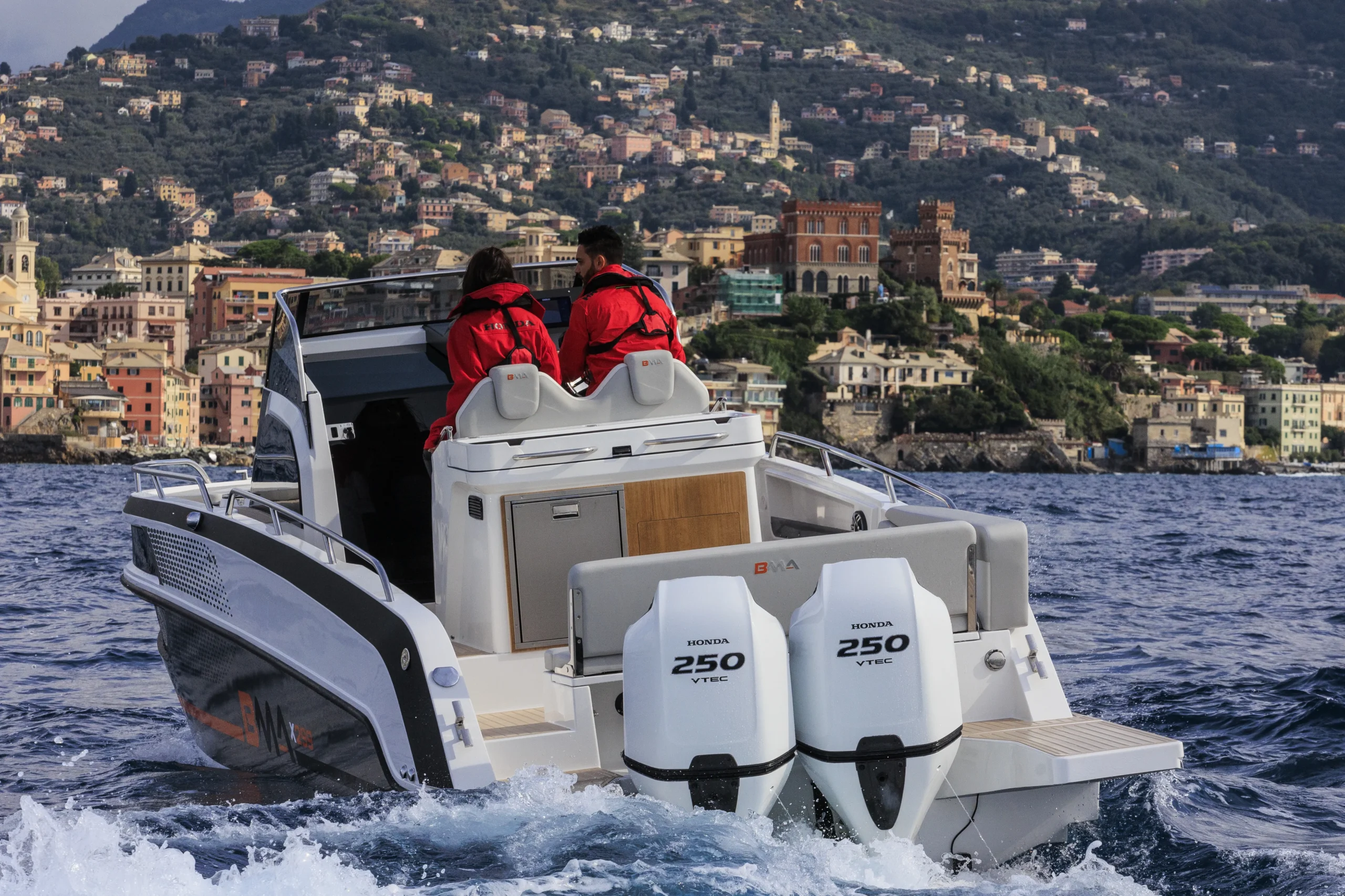 Der neue Kabinenkreuzer von Ribitaly kann bis zu zwölf Personen auf Tagesausflüge mitnehmen. Für längere Ausfahrten bietet er dank der beiden Doppelkojen, der Nasszelle mit WC, Dusche und Waschbecken und der Aussenpantry genügend Platz und Komfort für eine Familie. In den Schlafbereichen sorgen die helle Innenverkleidung und vor allem das viele Tageslicht, das durch die grossen Rumpffenster eindringt, für ein angenehmes Raumgefühl. Die Bugkabine fällt aufgrund des senkrechten Steven etwas grösser aus als die zweite Kabine unter dem Cockpit. Sie bleibt aber trotz ihrer Lage gut zugänglich. Im X299 werden zwei Konzepte geschickt zusammengeführt: das Mid-Cabin- und das Sundeck-Layout. Vom Cockpit führt eine Stufe zur Mittelkabine, zwei Stufen weiter oben befindet sich das Vordeck mit grosser Sonnenlounge. Die breiten Seitendecks sind durch ein halbes Schanzkleid mit durchgehender Reling gut geschützt und mit rutschfestem, synthetischem Teak verkleidet. Für den Antrieb stehen zwei Honda-Aussen-bordmotoren zur Wahl: 2 × 150 PS als Mindestleistung oder für alle, die es etwas schneller mögen, 2 × 300 PS.