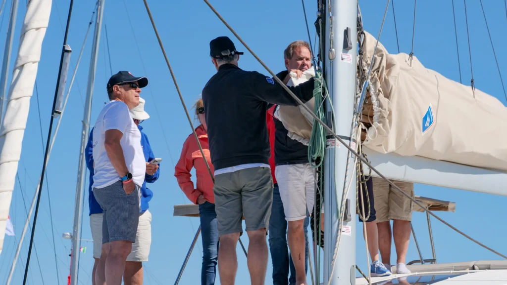 In Punta Ala liegen normalerweise überwiegend Einrümpfer. Nicht so an diesem langen Maiwochenende. 24 Fountaine-Pajot-Katamarane zwischen 40 und 59 Fuss hatten im exklusiven Hafen festgemacht. Man konnte sie unmöglich übersehen! Vom kleineren Modell Isla 40 bis hin zur fürstlichen Samana 59 war die Modellpalette der französischen Werft fast vollständig vertreten. Im Unterschied zum Treffen von 2022 in Kroatien, bei dem vor allem Charterboote teilgenommen hatten, waren die Eigner diesmal überwiegend mit ihren eigenen Katamaranen vor Ort. Noch überraschender war die starke Schweizer Beteiligung. Knapp ein Viertel der Boote segelte unter weissem Kreuz auf rotem Grund! Fünf Crews kamen aus der Schweiz: La Pinta (Helia 44), Lillesol (Elba 45), Maona, Blue Mandarin (Tanna 47) und Kapowai (Aura 51). Als Höhepunkt der Veranstaltung stand die freundschaftliche Regatta zur Insel Elba auf dem Programm. Sie führte bei 15 Knoten Wind und ruhigem Meer in weniger als drei Stunden nach Porto Azzurro. Obwohl es eigentlich um nichts ging, war der sportliche Ehrgeiz der Teams geweckt. Bereits am Start setzte sich des Isla 40 Terre von Richard und Dorothée an die Spitze und führte das Feld praktisch über die ganze Strecke an. Kurz vor der Ziellinie wurde er dann doch noch vom Astrea 42 Migaloo 2 abgefangen. Schuld war der unberechenbare Abwind aus den Bergen hinten in der Bucht. Manche Teilnehmer beendeten das Rennen unter Motor, denn die Zielboje war bei den wechselnden Bedingungen unter Segeln nur schwer zu erreichen. Platz drei ging an den Astrea 42 des Fountaine-Pajot-Teams. Der Kat segelte ohne Gennaker und Spi, was das Ergebnis umso bemerkenswerter macht. Auf dem Rückweg in den Golf von Follonica wurden bei Wind von Backbord erneut die Vorwindsegel gesetzt. Gezogen von seinem rot-weissen Gennaker übernahm der Tanna 47 Maona die Führung. Auf halber Strecke startete Lillesol, dessen grosser blauer, asymmetrischer Spi alle Blicke auf sich zog, einen Angriff, blieb aber erfolglos. Als Dritter klassierte sich Terre. Er bewies, dass Grösse nicht alles ist, sondern dass ein sauberer Rumpf und Faltpropeller den Ausschlag geben können. An Land wurde geschlemmt und lokale Produkte degustiert. Die geplante Parade rund um die geheimnisvolle Insel westlich des Hafens und das gemeinsame Ankern im Golf von Follonica mussten wegen zu viel Nordwind abgesagt werden. Stattdessen konnten die 120 Teilnehmenden Workshops zu den Themen Segelmachen und Bordelektronik besuchen und dabei viel lernen.