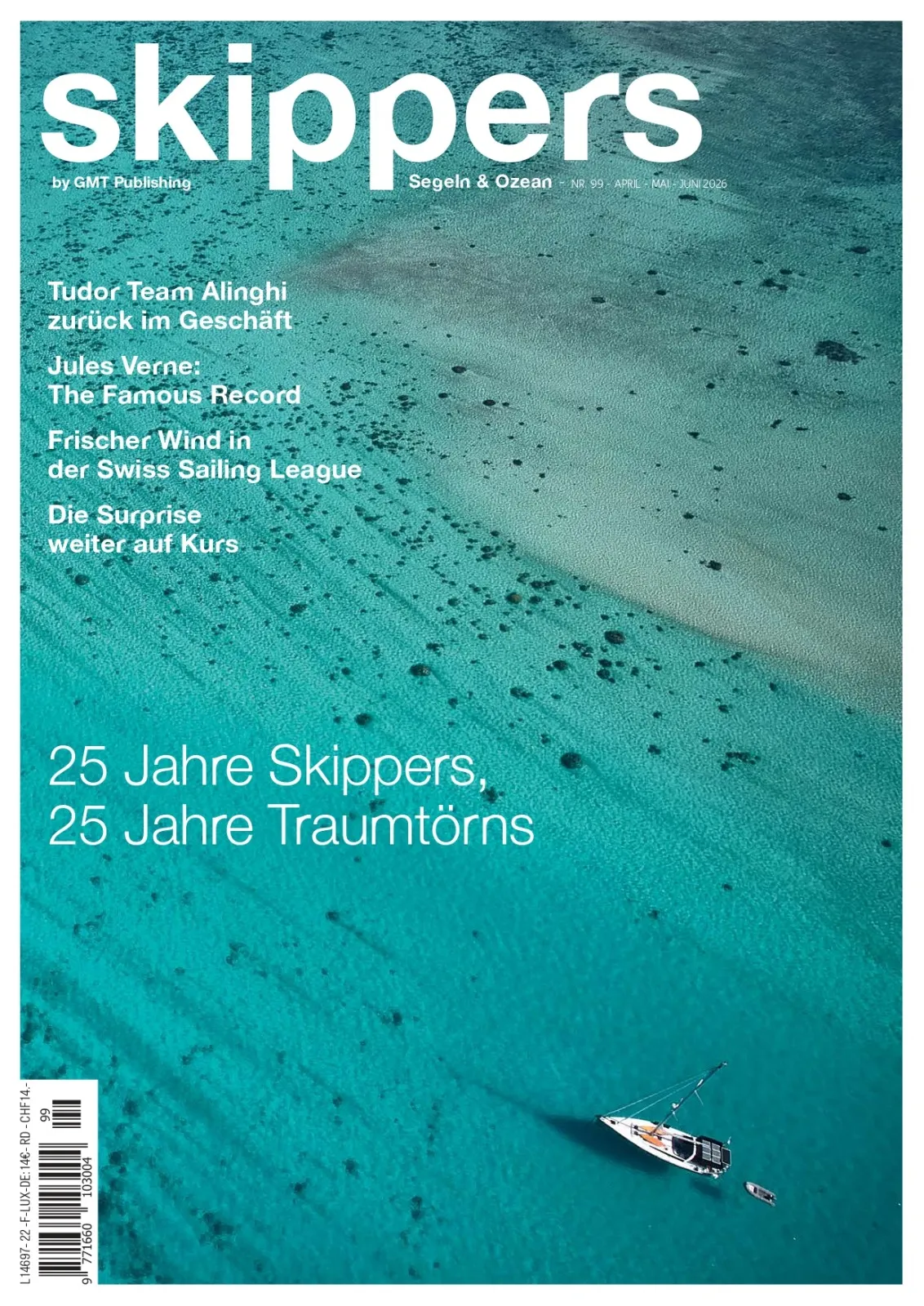25 Jahre. Ein Vierteljahrhundert. Und ein glück- licher Terminzufall. Als 2001 die erste Ausgabe von Skippers erschien, schrieb dessen Gründer Brice Lechevalier darin über die Anfänge des fabelhaften Abenteuers Alinghi. Genau 25 Jahre später – pünktlich zu unserem runden Jubilä- um –, kündigte das Schweizer Syndikat nach einem aufsehenerregenden Abzug die Rückkehr in den America’s Cup an. Und beides Mal ist unsere – Ihre – Zeitschrift in der ersten Reihe. Natürlich haben wir es uns nicht nehmen lassen, nach Neapel zu reisen und Ernesto Bertarelli im Rahmen des 38. America’s Cups zu treffen. Auf den folgenden Seiten reisen wir mit Ihnen zudem über die Weltmeere. Wir berichten über den Frauenrekord und die absolute Bestzeit der Jules Verne Trophy und analysieren die Leistung des Switzerland SailGP Teams an den ersten drei Events des SailGP.