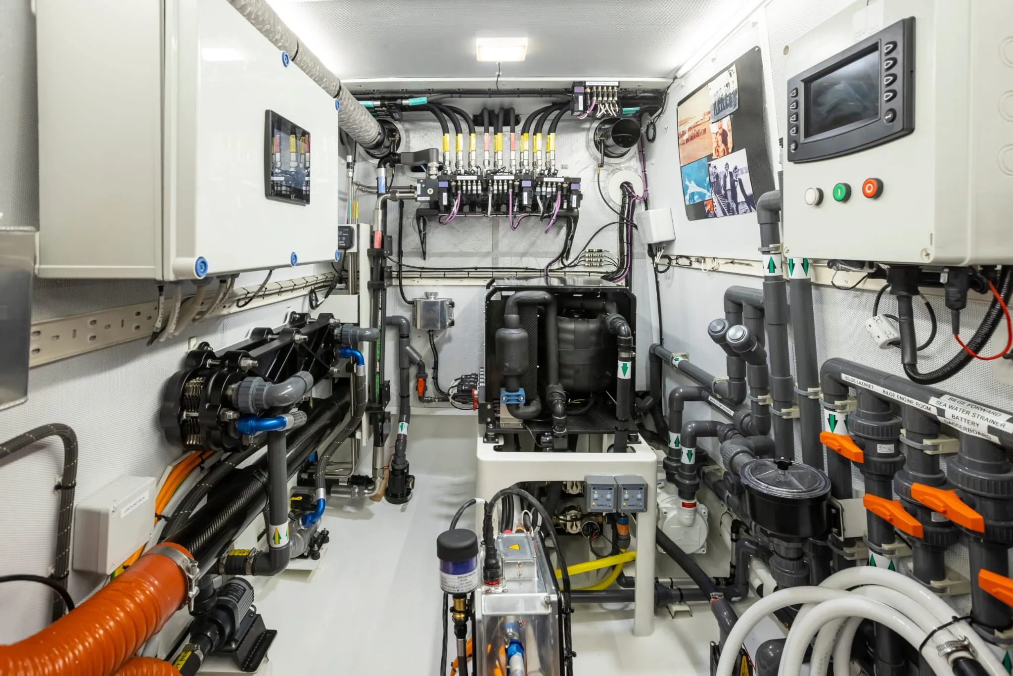 Zu diesen beiden Anforderungen kam eine dritte hinzu: Die Jacht sollte energieautonom sein. Eine Batterieladung, sprich fünfstündiges Aufladen im Hafen, sollte für einen Regattatag reichen. Auf der Magic Carpete werden alle Manöver elektrisch ausgeführt, angefangen beim Kiel. Er wurde von Guillaume Verdier entworfen und in der Werft Persico gebaut. Das technische Meisterwerk lässt sich um 45° schwenken und hinten anheben, wodurch sich der Tiefgang der neun Tonnen schweren Bombe in Sekundenschnelle von 7,1 auf 4,6 Meter verringert. Ein 5,5 Meter langes Schwert verhindert das Abdriften.