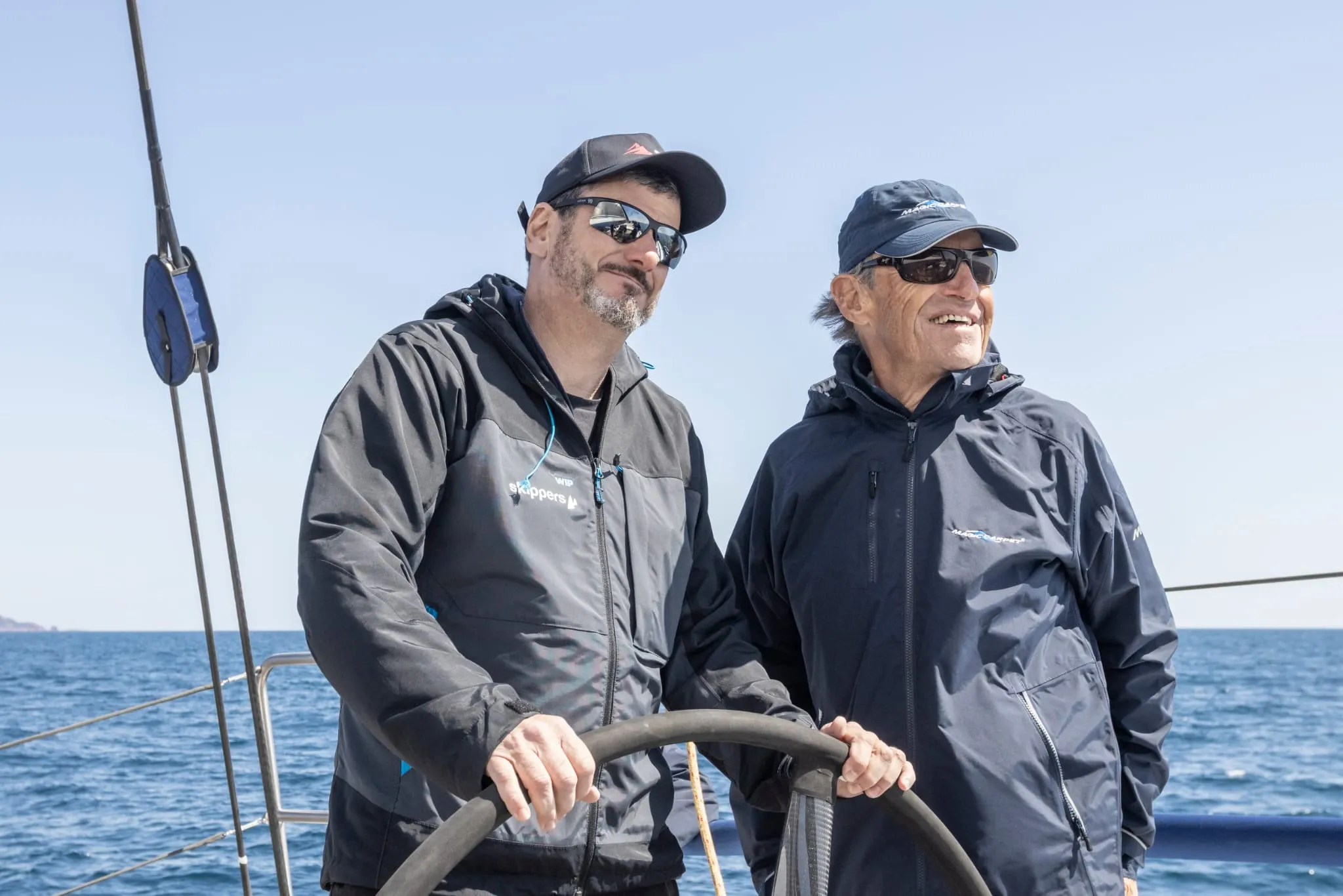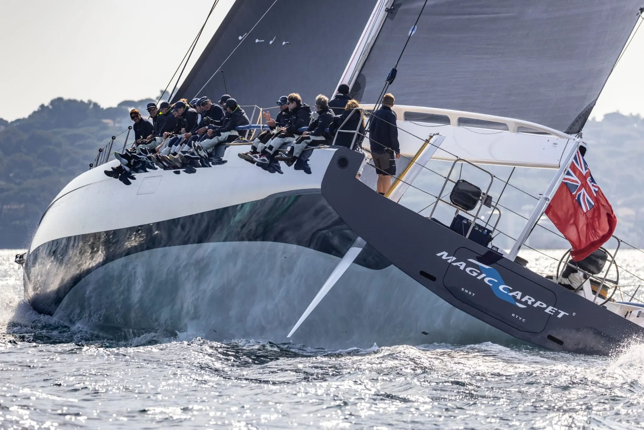An diesem Aprilsonntag sticht die Magic Carpete zu einer Probefahrt in See. Skipper Danny Gallichan ist seit 1995 an der Seite von Sir Lindsay und kennt alle Magic Carpets gut. Mit der Fernbedienung stellt er den Kiel ein, hebt das Ruderblatt im Luv und justiert das Schwert. «Das Schwert ist mit einem Ruderblatt im Bug vergleichbar», erklärt er. «Es lässt sich schwenken, damit es immer senkrecht im Wasser steht.» An Deck koordiniert Projektmanager Edward Bell die Manöver, während Marcel van Triest unter Deck auf seinen Bildschirm schaut. Der Elitesegler und anerkannte Meteorologe hat schon zahlreiche IMOCA-Jachten gesteuert und war als Stratege beim Ocean Race und als Router an der Jules Verne Trophy dabei. Für Regatten holt Sir Lindsay zudem jeweils Francesco de Angelis an Bord, der im Jahr 2000 mit Luna Rossa den Louis Vuitton Cup gewann. Die Magic Carpete verlässt den Golf von St. Tropez und nimmt bei leichter Frühlingsdünung Kurs ostwärts. Trotz ihrer Grösse reagiert sie erstaunlich schnell und direkt auf Steuerbewegungen, weshalb viel Fingerspitzengefühl und Präzision gefragt sind. Falsche oder zu heftige Impulse fordern sofort ihren Tribut. Die meiste Zeit – vor allem bei Regatten – steuert Sir Lindsay die Jacht selbst. Er freut sich auf das Kräftemessen mit den anderen 100-Fuss-Maxis, weil er selbst an der Entwicklung der Cento-Reihe beteiligt war. Besonders gespannt ist er auf das Wiedersehen mit seinem alten Boot, der Wally Magic Carpet 3 (Cubed).