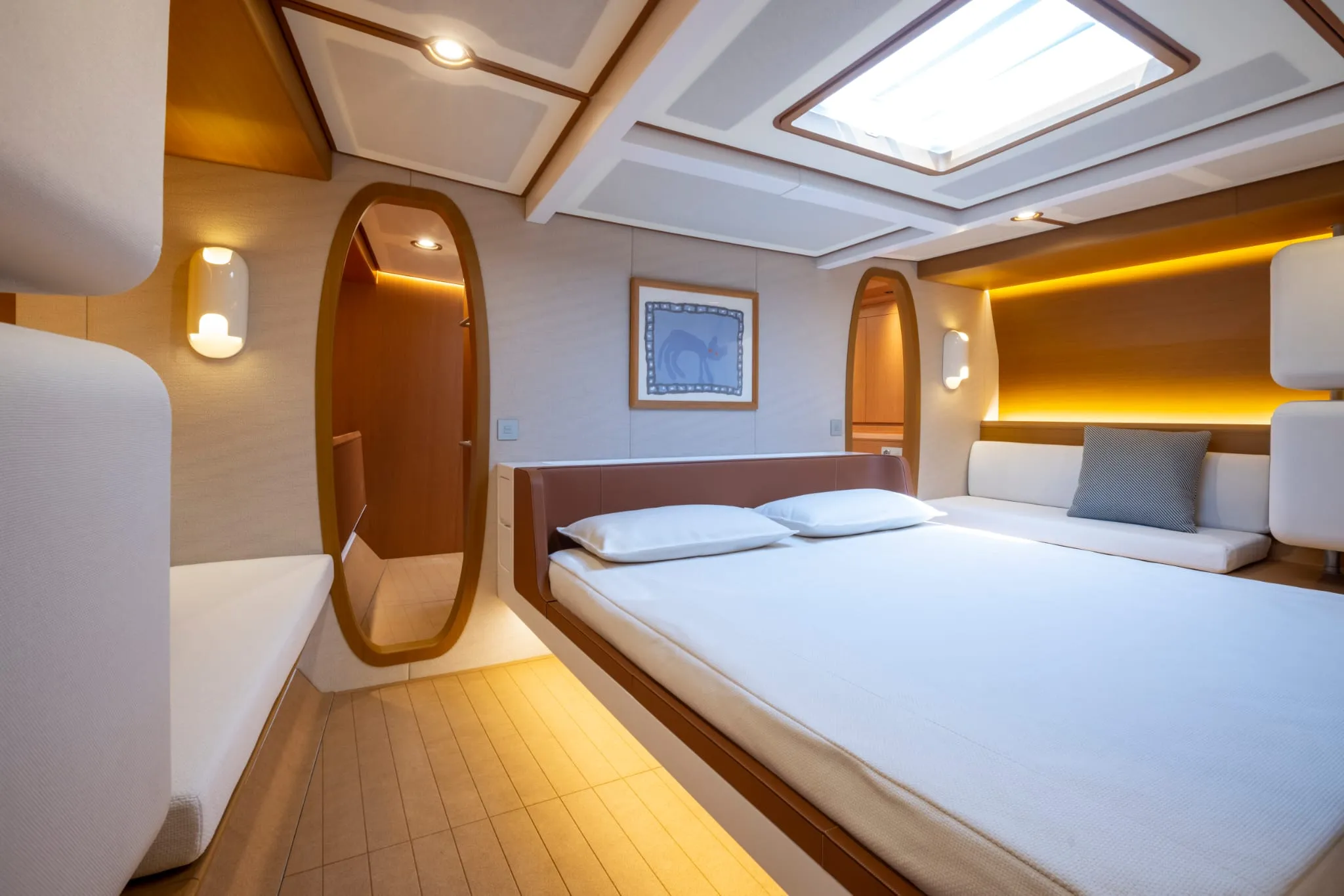 Wie in einem Märchen aus 1001 Nacht schiesst die 37 Tonnen schwere Magic Carpete bei zehn Knoten Wind mit 15 Knoten übers Wasser. Hohes Gross, Genua 2, Fock 2: Die Maxi-Jacht hat ihre Medium-Segel gehisst, insgesamt tausend Quadratmeter Carbontuch. Schon bei der kleinsten Ruderbewegung reagiert das Boot blitzschnell. Die Winschen pfeifen, die elektrischen Pumpen des Schwenkkiels heulen. Nur das typische Brummen des Dieselmotors fehlt. Fünfzehn gleichmässig auf die Luvschiene verteilte Crewmitglieder warten konzentriert auf die Anweisungen des Skippers. Im Achterschiff gibt mir Lindsay Owen-Jones wertvolle Tipps. Dreissig Jahre als Skipper von Maxis haben ihn sein Handwerk gelehrt. Der französischste aller britischen CEOs ist seit 2011 pensioniert. Er machte L’Oréal nach der Jahrtausendwende zum Weltkonzern und wurde von der Queen mit der Ehrenlegion ausgezeichnet. Auch während seiner beruflichen Karriere lebte Sir Lindsay seine sportliche Leidenschaft stets auf höchstem Niveau aus. Als Autorennfahrer fuhr er mit seinem McLaren bei den 24 Heures du Mans 1996 auf den fünften Platz. Auf dem Meer ersegelte er mit seinen Jachten zahlreiche Siege, so an der Giraglia oder an den Voiles de Saint-Tropez. Heute, mit knapp 80 Jahren, ist Sir Lindsay noch immer topfit und sportlich aktiv. Magic Carpete ist sein vierter fliegender Teppich. Er gehört mit seinen 100 Fuss Länge zur prestigeträchtigen Kategorie der Wallicento. Sir Lindsay ist ein angefressener Regatteur, mag aber auch gemütliche Törns mit Freunden und Familie. Die neue Jacht sollte daher beiden Ansprüchen gerecht werden: sportlich und gleichzeitig komfortabel sein. Axel de Beaufort hat das Innere entsprechend elegant und wohnlich gestaltet.
